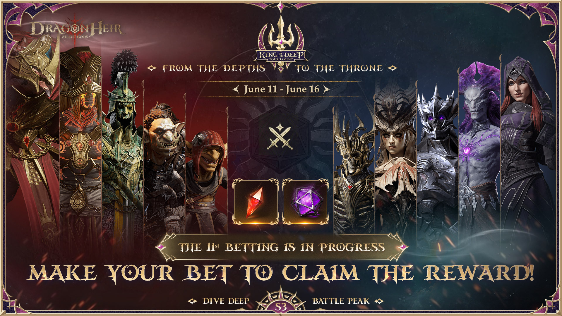 Phase XI is almost here! Choose your team (Red or Blue) and place your bet to get great rewards! ⏰ Phase XI Betting Period: Jun 11th - Jun 16th ????Make a bet and win the reward: Winners: Wyrmarrow x200 Losers: Starlight Stone Dice x1 ????Log in now and pick your side! ???? From the Depths, To the Throne #dragonheir #dragonheirsilentgods #downloadnow ???? Download Dragonheir NOW: https://bit.ly/dragonheir-downloadnow
