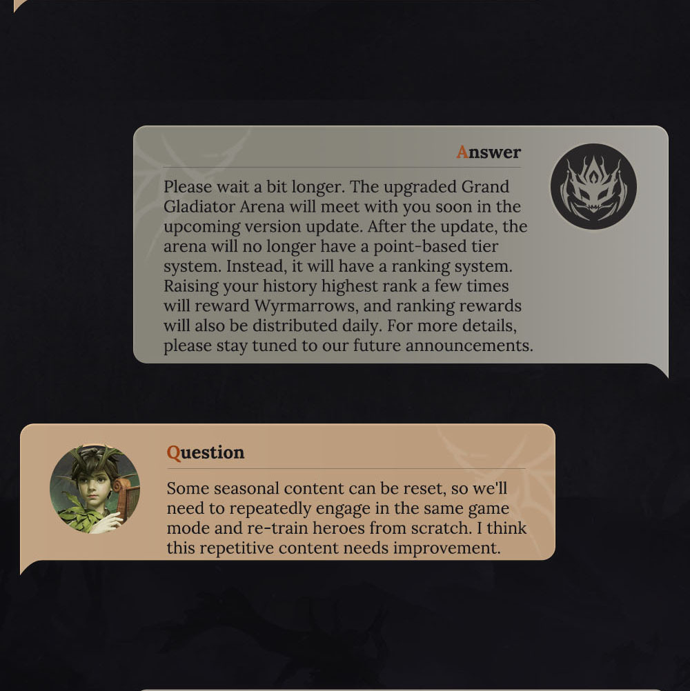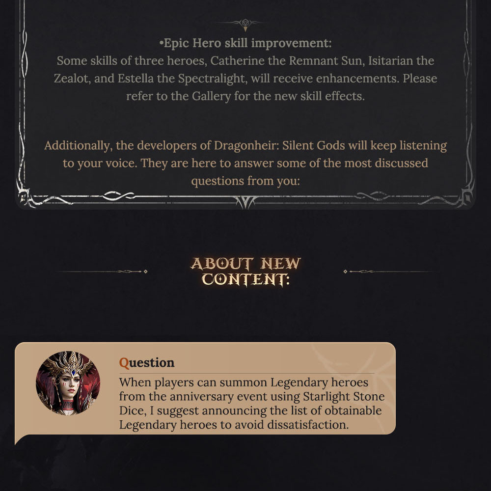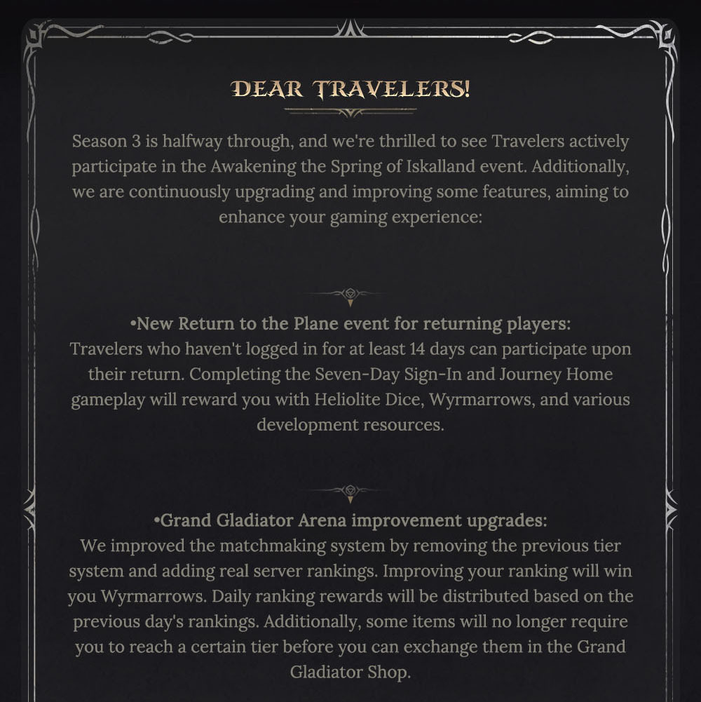 ????️Introducing exciting new updates! Returning players can now join the Return to the Plane event, designed for those who haven't logged in for at least 14 days. Participate in the Seven-Day Sign-In and Journey Home gameplay to earn Heliolite Dice, Wyrmarrows, and other valuable resources. Additionally, we've enhanced the Grand Gladiator Arena by removing the tier system and adding real server rankings, with rewards based on daily rankings. We've also upgraded some Epic Hero skills for Catherine the Remnant Sun, Isitarian the Zealot, and Estella the Spectralight.