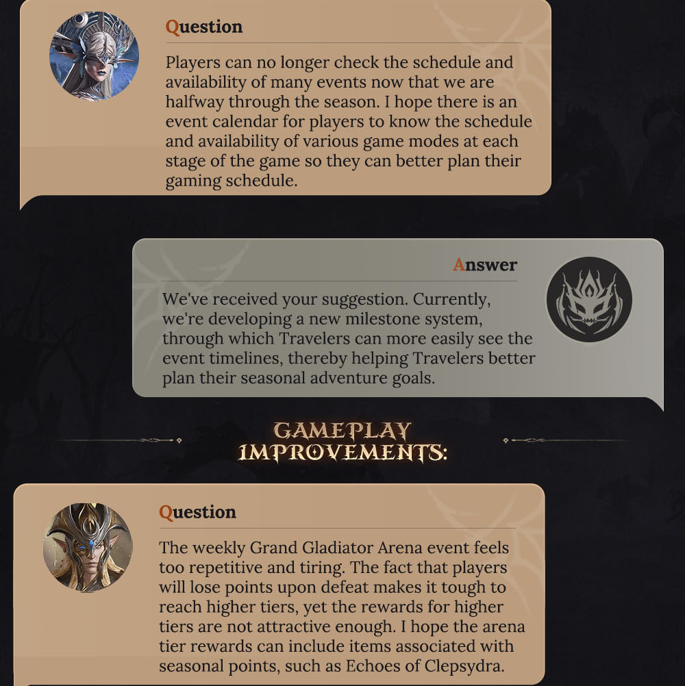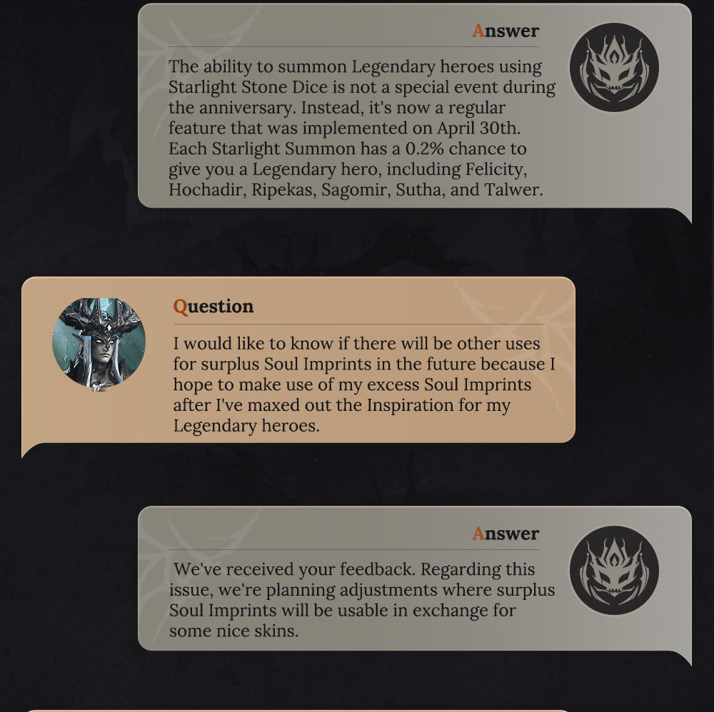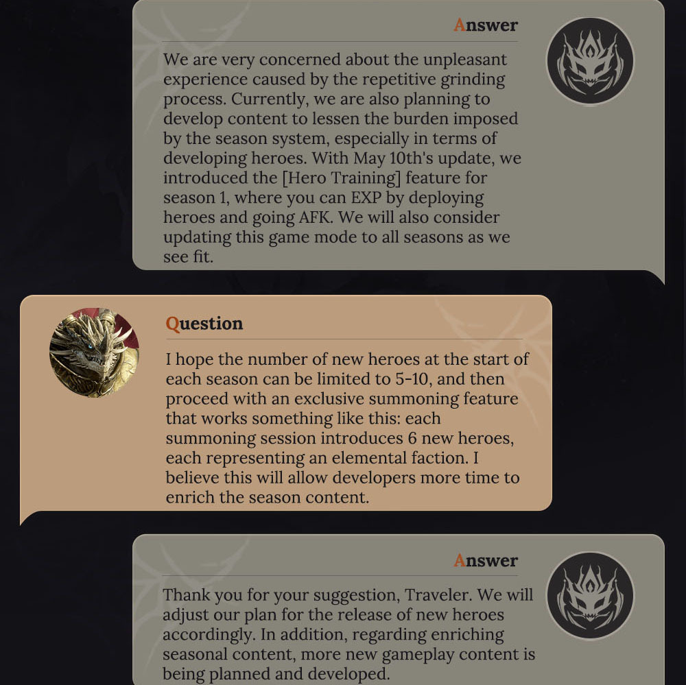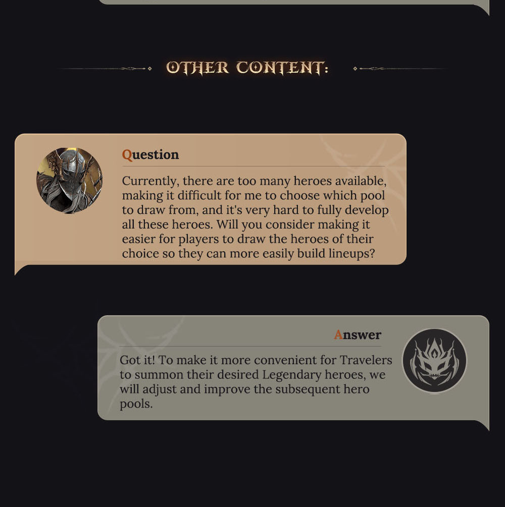 ????️Introducing exciting new updates! Returning players can now join the Return to the Plane event, designed for those who haven't logged in for at least 14 days. Participate in the Seven-Day Sign-In and Journey Home gameplay to earn Heliolite Dice, Wyrmarrows, and other valuable resources. Additionally, we've enhanced the Grand Gladiator Arena by removing the tier system and adding real server rankings, with rewards based on daily rankings. We've also upgraded some Epic Hero skills for Catherine the Remnant Sun, Isitarian the Zealot, and Estella the Spectralight.