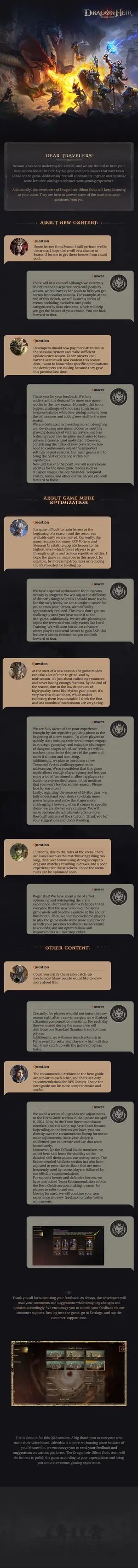 We're listening to your feedback and are committed to enhancing your gaming journey! ???? ???? New way to draw heroes from past seasons; updates on dungeons, Fey Meander, Temporal Vortex, Arena, and other game modes; a new feature where you can send heroes to get extra EXP; a return event to help the players catch up with the game progress; and much more! ????️ Check out the pictures for detailed insights into these enhancements. Your feedback continues to shape the future of Adenthia! Keep those suggestions and questions coming! ✨ ???? Dive Deep, Battle Peak! #dragonheir #dragonheirsilentgods #downloadnow ???? Download Dragonheir NOW: https://bit.ly/dragonheir-downloadnow