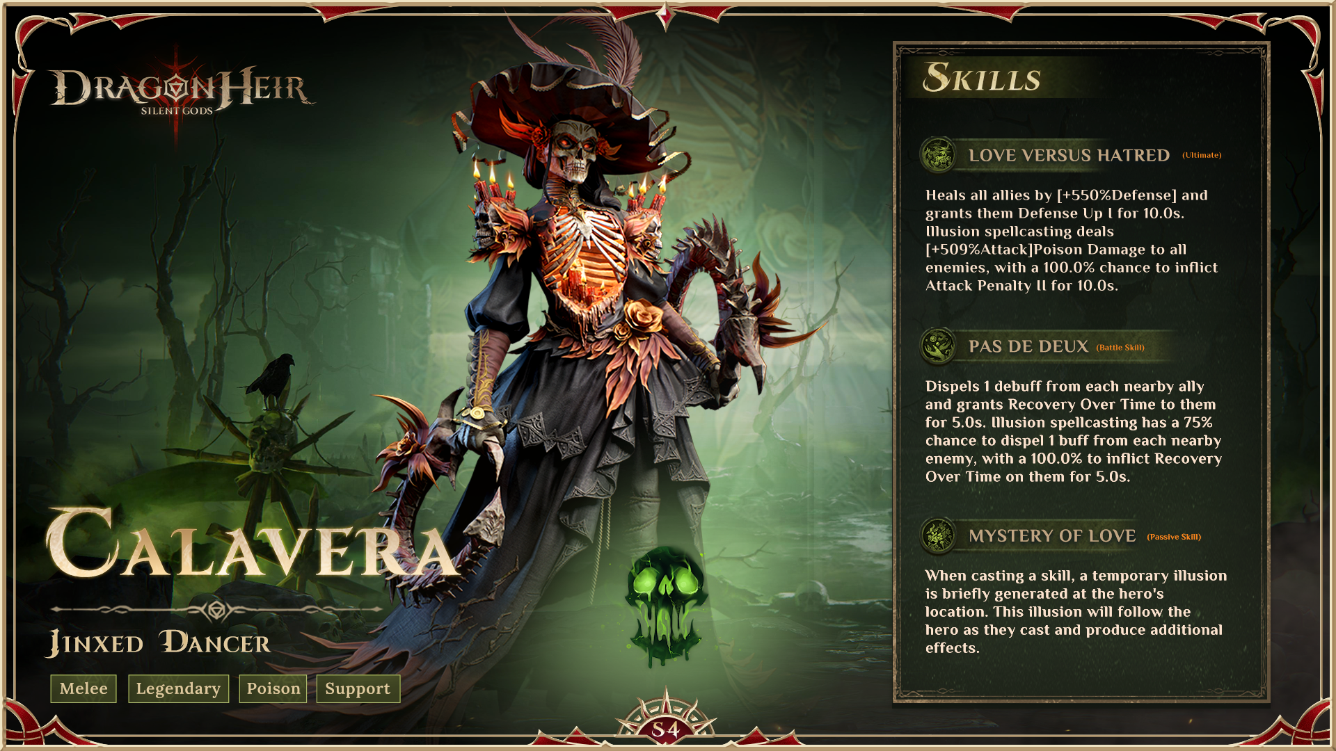 ???? Calavera, the Masked Dancer ☠️ [Melee, Legendary, Support] Element: Poison Calavera, a masked dancer with a mysterious past, arrives in the city, captivating all with her exotic grace. But beneath her enchanting demeanor lies a dark secret - a thirst for vengeance against those who betrayed her. Once a celebrated dancer, assassin, and spy, Calavera's life took a tragic turn, leading her to become an undead soul. Now, she seeks to punish those who wronged her, their deceitful words of "love" forever echoing in her mind. Witness Calavera's deadly dance in the image below! Don't miss the opportunity to get her in the upcoming new Season 4!???? New Season 4 will start at June 21st, get ready to join the Epic war! #dragonheir #dragonheirsilentgods #downloadnow ???? Download Dragonheir NOW: https://bit.ly/dragonheir-downloadnow