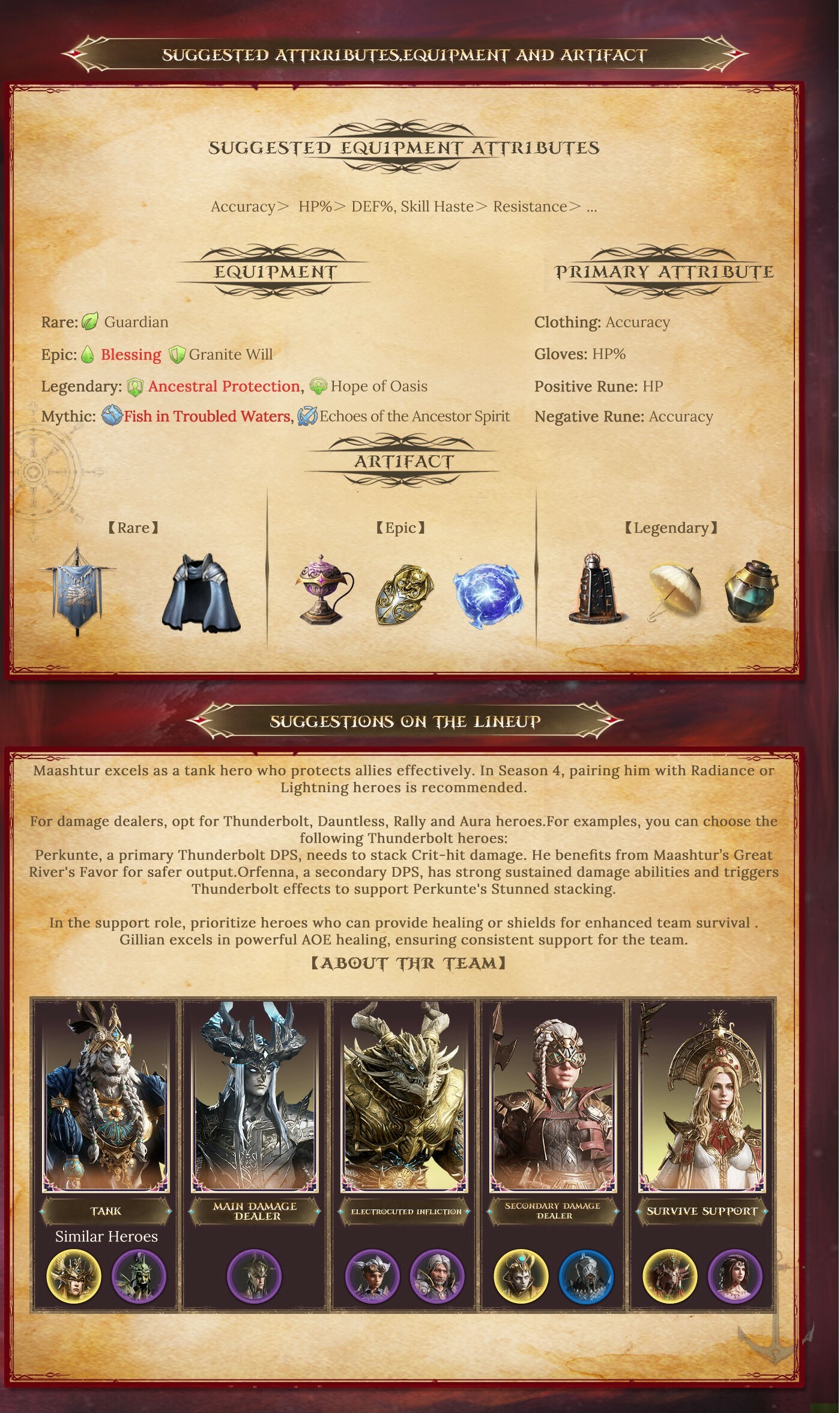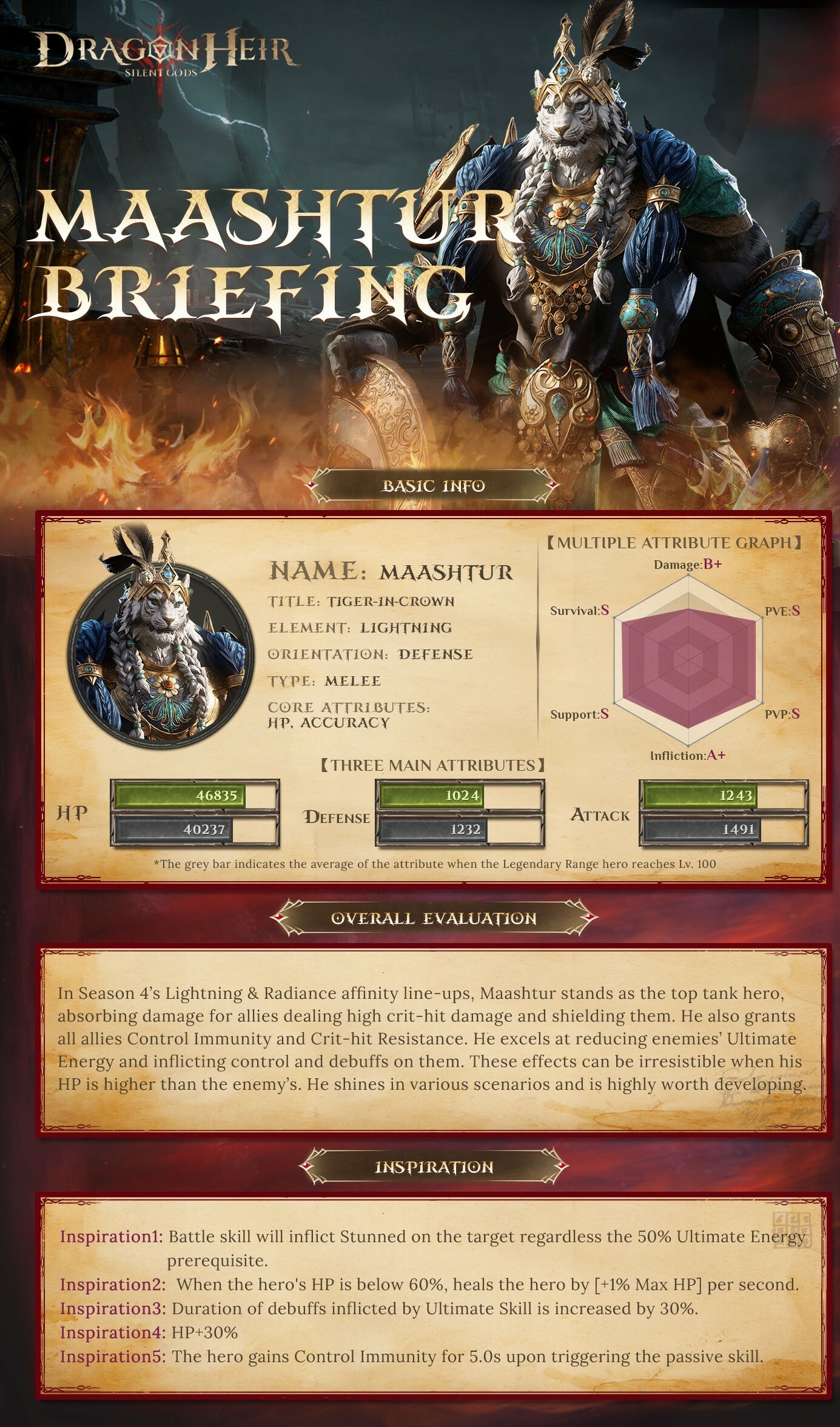 While Maashtur's prowess in defense is unmatched, his abilities become irresistible when his HP is higher than the enemy's. Thus, pairing him with healing or HP-boosting heroes becomes essential for enduring battles.