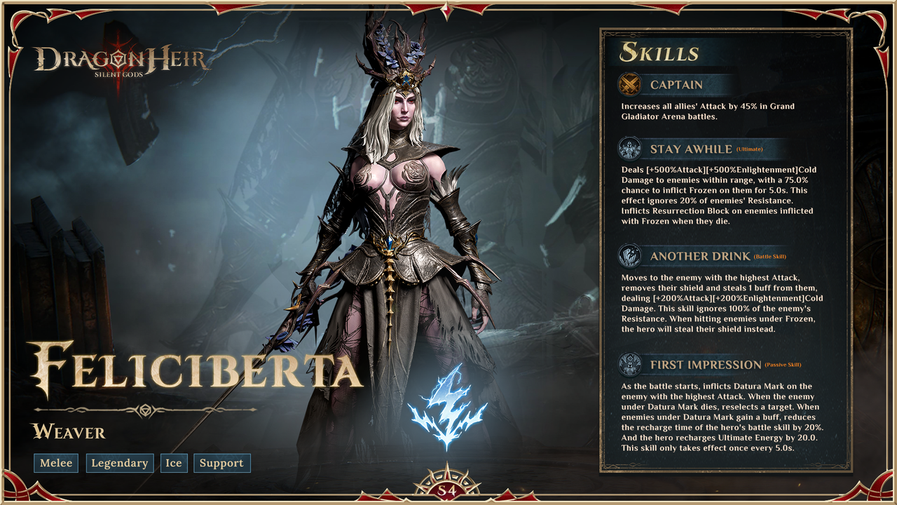 ❄️ Feliciberta, the Weaver ???? [Melee, Legendary, Support] Element: Ice Feliciberta, a mysterious figure renowned for her mastery of ice and cunning strategies, enters the fray. Her unique abilities focus on controlling the battlefield, disrupting enemy tactics, and empowering her allies. With her Captain skill boosting her team's Attack in the Grand Gladiator Arena, her Ultimate freezing and hindering foes, and her Battle Skill stealing buffs, Feliciberta is a force to be reckoned with. Unleash Feliciberta's icy prowess in the Celestial Alternate Summons III. #dragonheir #dragonheirsilentgods #downloadnow ???? Download Dragonheir NOW: https://bit.ly/dragonheir-downloadnow