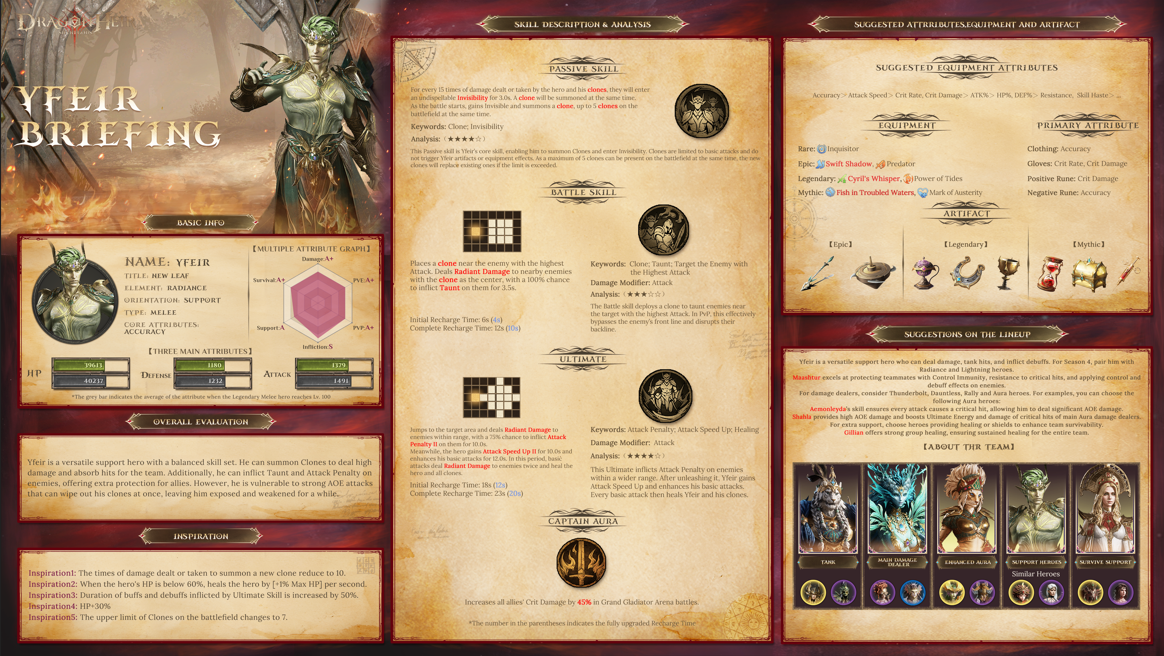 Yfeir is a versatile support hero known for his balanced skill set and unique abilities. As a master of Radiance, he brings light and protection to his allies on the battlefield. Yfeir's ability to summon Clones allows him to deal high damage and absorb hits, providing crucial support to his team. His skills include inflicting Taunt and Attack Penalty on enemies, drawing their attacks away and reducing their offensive capabilities. However, Yfeir's clones are vulnerable to strong AOE attacks, which can wipe them out quickly and leave him exposed. Summon Yfeir and harness the protective power of the New Leaf!✨ #dragonheir #dragonheirsilentgods #downloadnow ???? Download Dragonheir NOW: https://bit.ly/dragonheir-downloadnow