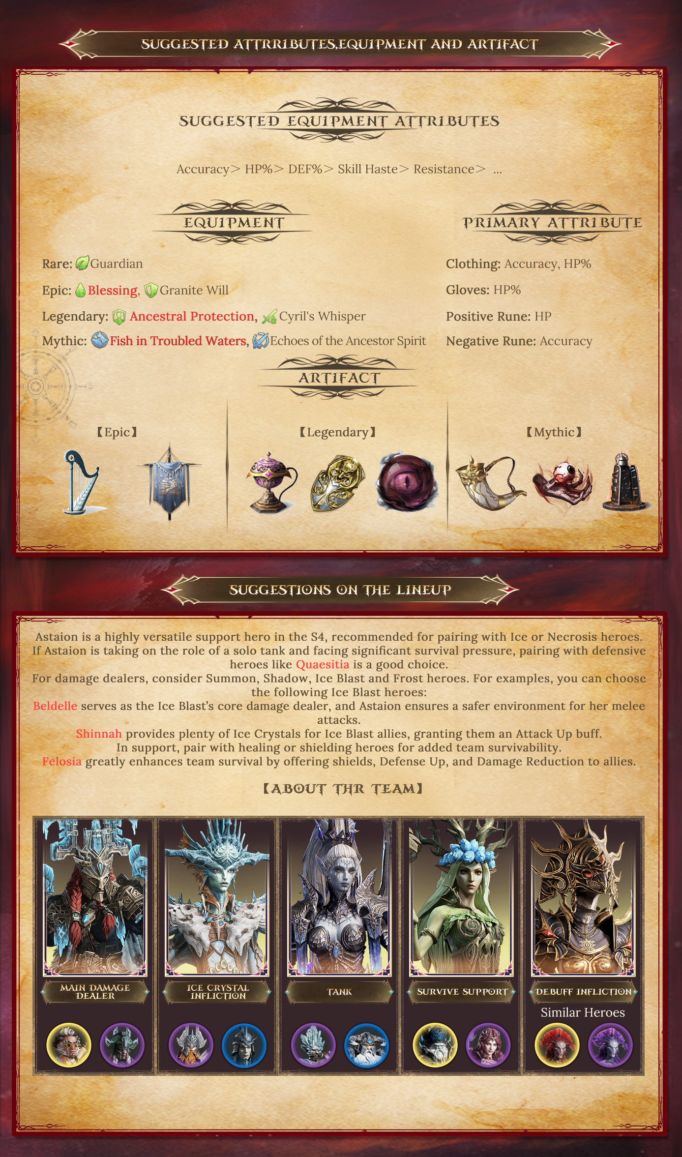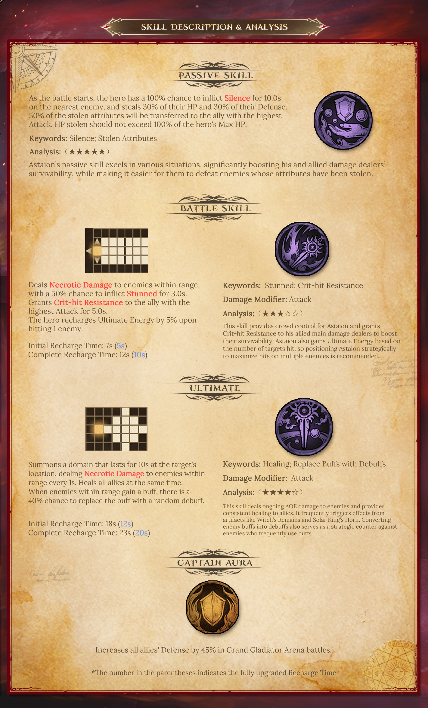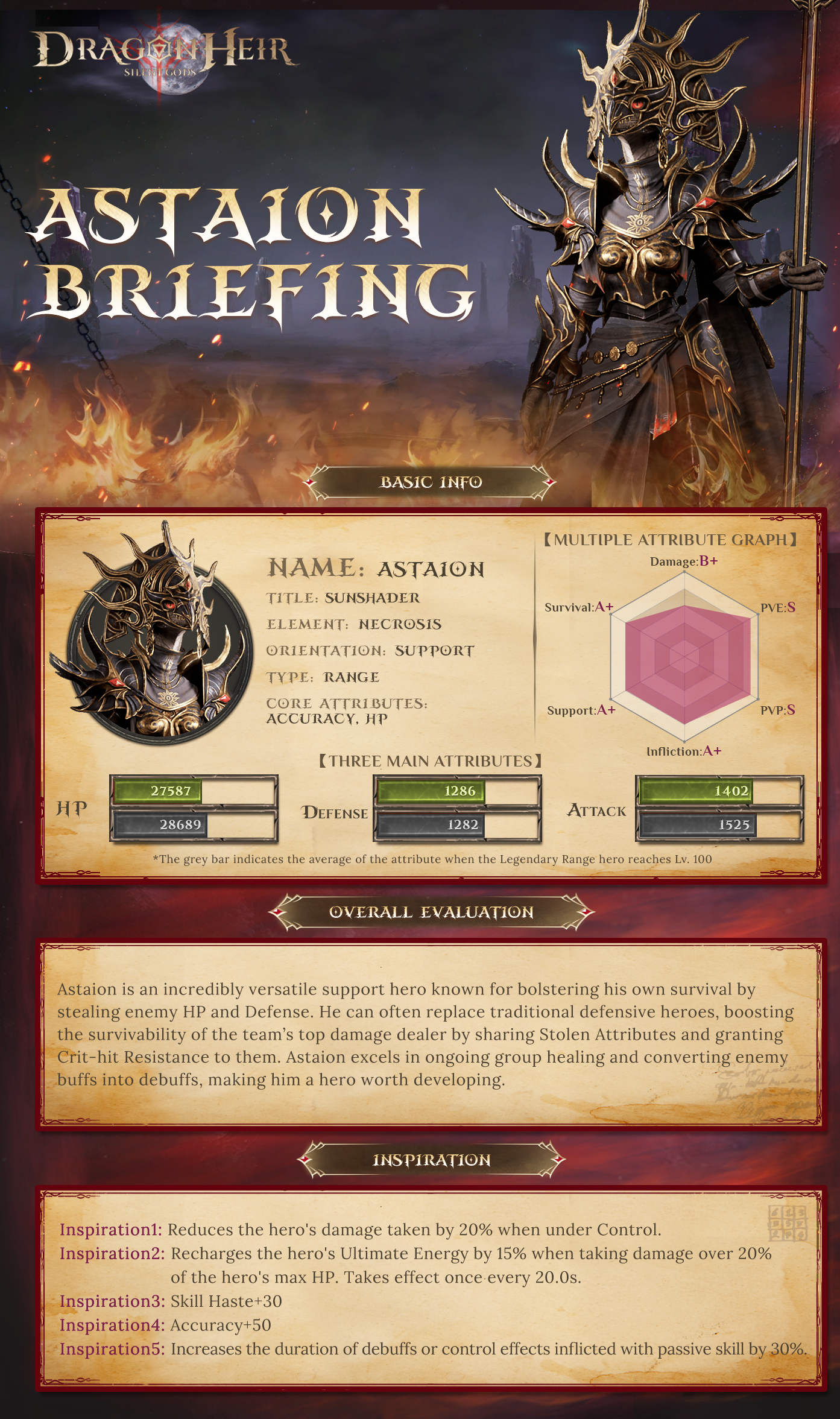 Astaion is an incredibly versatile support hero known for bolstering his own survival by stealing enemy HP and Defense. He can often replace traditional defensive heroes, boosting the survivability of the team’s top damage dealer by sharing Stolen Attributes and granting Crit-hit Resistance to them. Astaion excels in ongoing group healing and converting enemy buffs into debuffs, making him a hero worth developing.