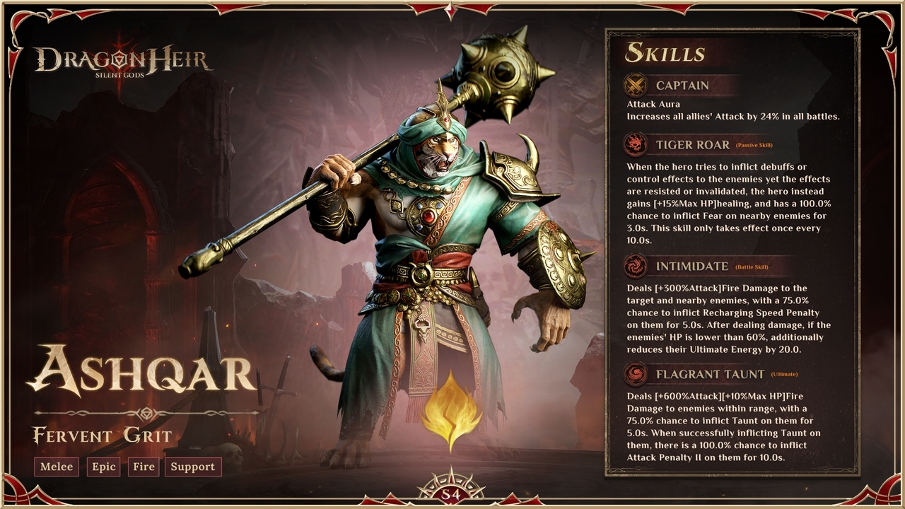 [Melee, Epic, Support] Element: Fire Ashqar, a fearless warrior, burns with the determination to protect and support his allies. With his searing attacks and unyielding spirit, Ashqar excels in weakening enemies and turning the tide of battle in your favor. His powerful skills not only inflict devastating damage but also control the battlefield with taunts and penalties, making him an essential asset in any lineup. Unleash Ashqar's fiery potential in Blessed Summon 4 and let his unwavering grit lead your team to victory!???? #dragonheir #dragonheirsilentgods #downloadnow ???? Download Dragonheir NOW: https://bit.ly/dragonheir-downloadnow