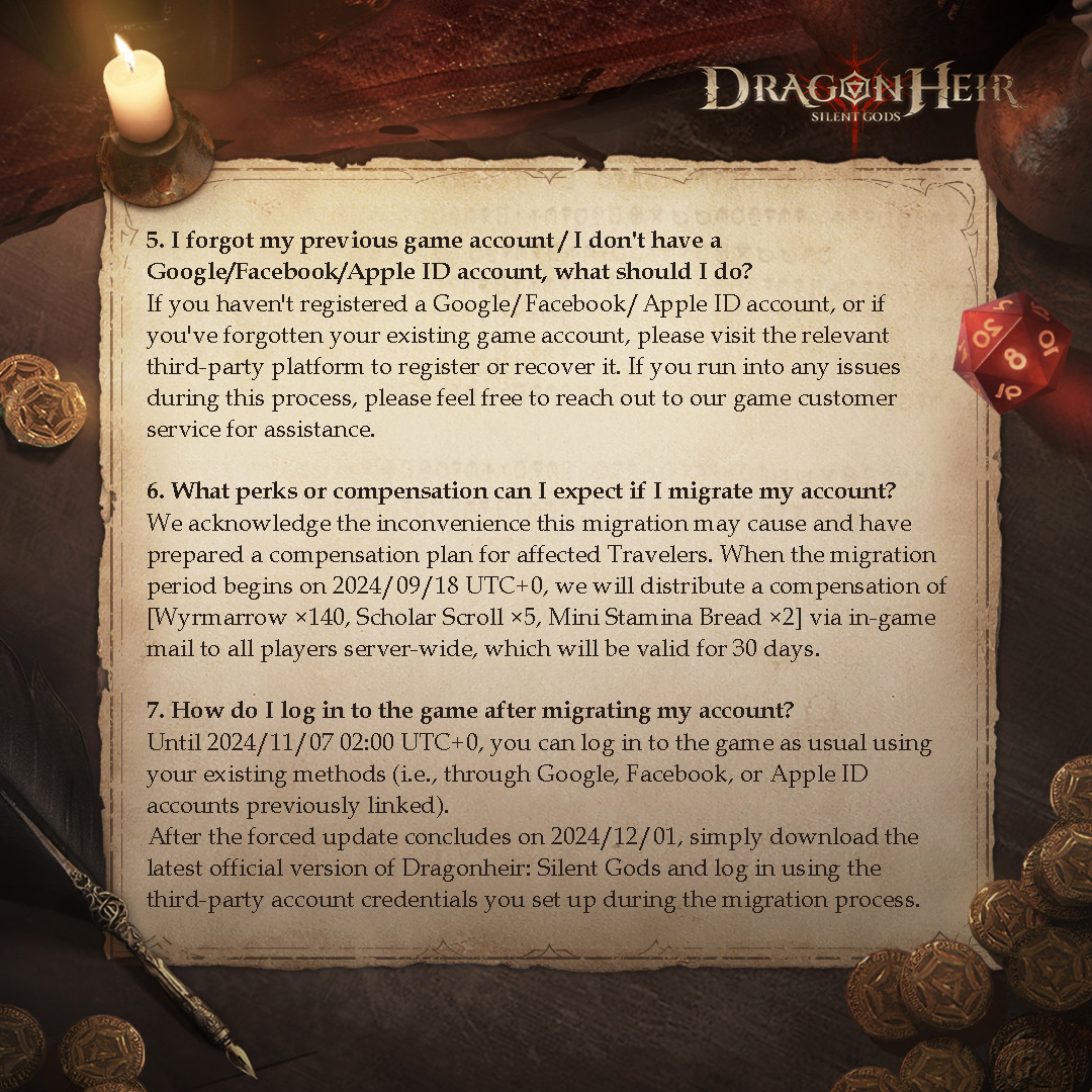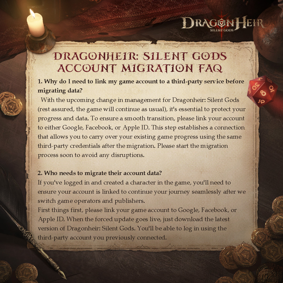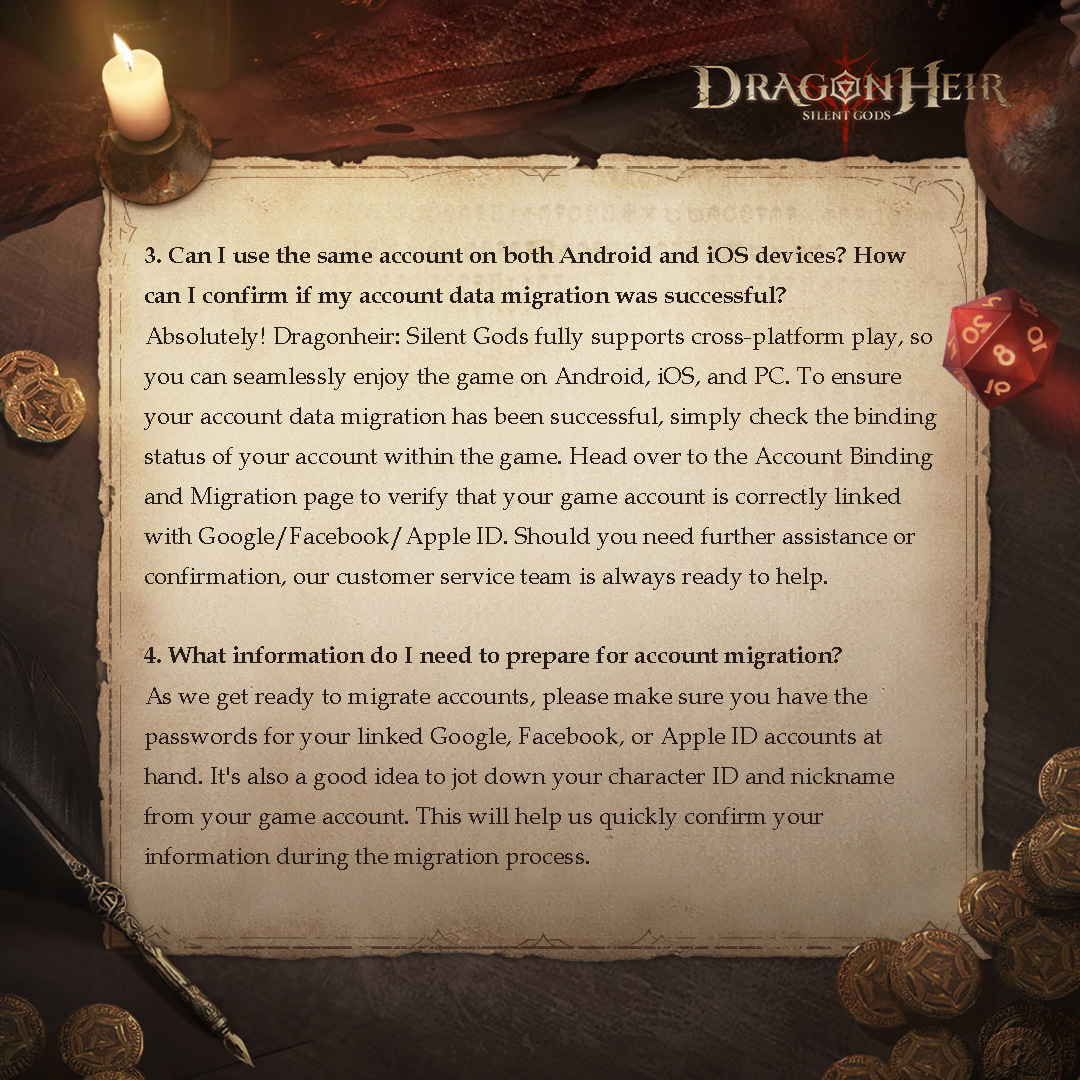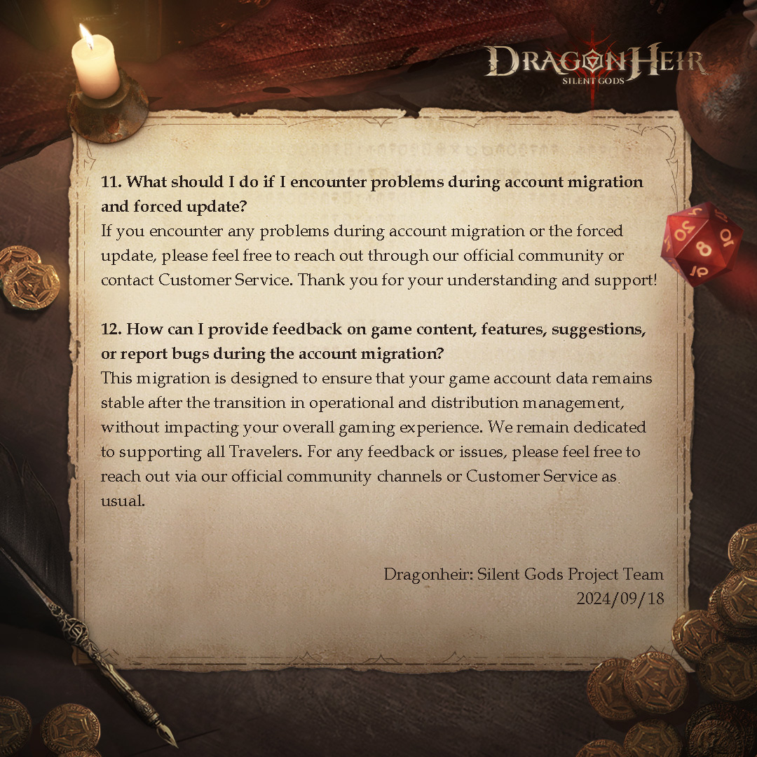 Thank you so much for your unwavering support for Dragonheir: Silent Gods! We fully understand that significant questions and concerns may arise with the account data migration. Ensuring an exceptional experience for every traveler is not just our priority—it's our commitment to you. To facilitate a clearer understanding of the upcoming changes, we've crafted detailed guidance for you. Our goal is to ensure every traveler transitions smoothly and seamlessly. Should further questions arise, please do not hesitate to contact us through our official community forums or our dedicated online customer service. We're here to assist every step of the way as we continue to build amazing adventures together!