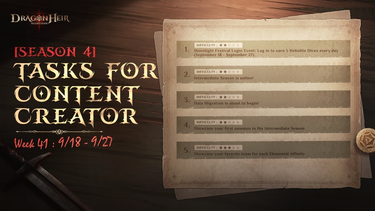Dear Travelers, We’re excited to announce the Week 41 Mission! The new tasks have been updated (details in the image below). Make sure to tag your submissions with #week41mission1/2/3/4/5/6/7/8 (e.g., #week41mission2) when posting your content on ⁠????┆creator-youtube. Content without the tag won’t be counted, so don't miss out! Complete your mission and earn 1 Heliolite Dice as a reward—settled weekly! ???? Event Period: September 18 - September 27 Deadline: 0:00 AM on September 28th (UTC). Only one submission per person. Thank you for your amazing creativity and continued support! #dragonheir #dragonheirsilentgods #downloadnow Download Dragonheir NOW: https://bit.ly/dragonheir-downloadnow