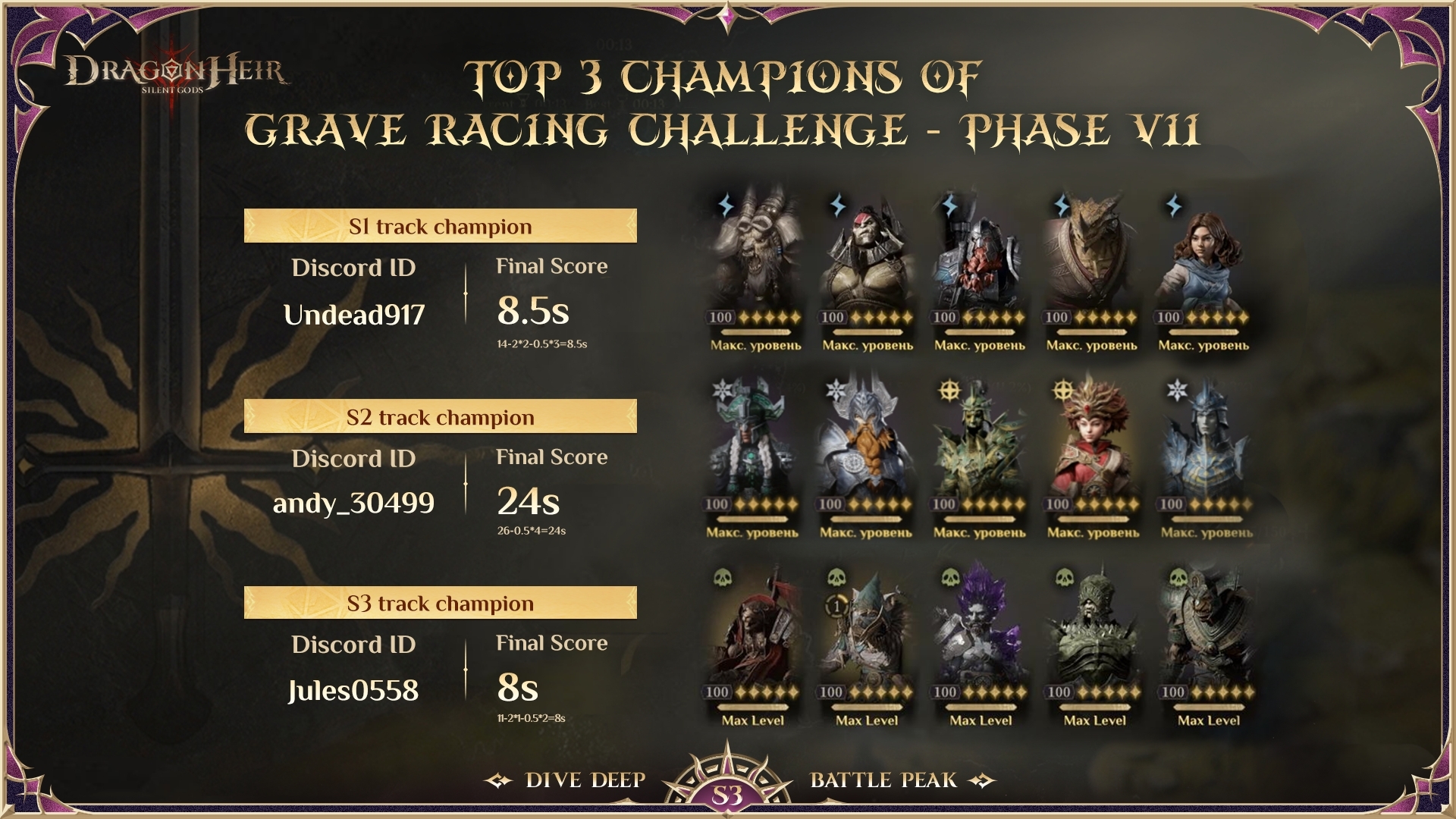 ???? S1 track champion Discord ID: Undead917 score: 14-2*2-0.5*3=8.5s ???? S2 track champion Discord ID: andy_30499 score: 26-0.5*4=24s ???? S3 track champion Discord ID: Jules0558 score: 11-2*1-0.5*2=8s ???? Join the challenges now for a chance to claim incredible rewards! ???????? PS. Rewards through Discord DMs, Winners. Please make sure you don't miss out the messages! ???? From the Depths, To the Throne #dragonheir #dragonheirsilentgods #downloadnow ???? Download Dragonheir NOW: https://bit.ly/dragonheir-downloadnow