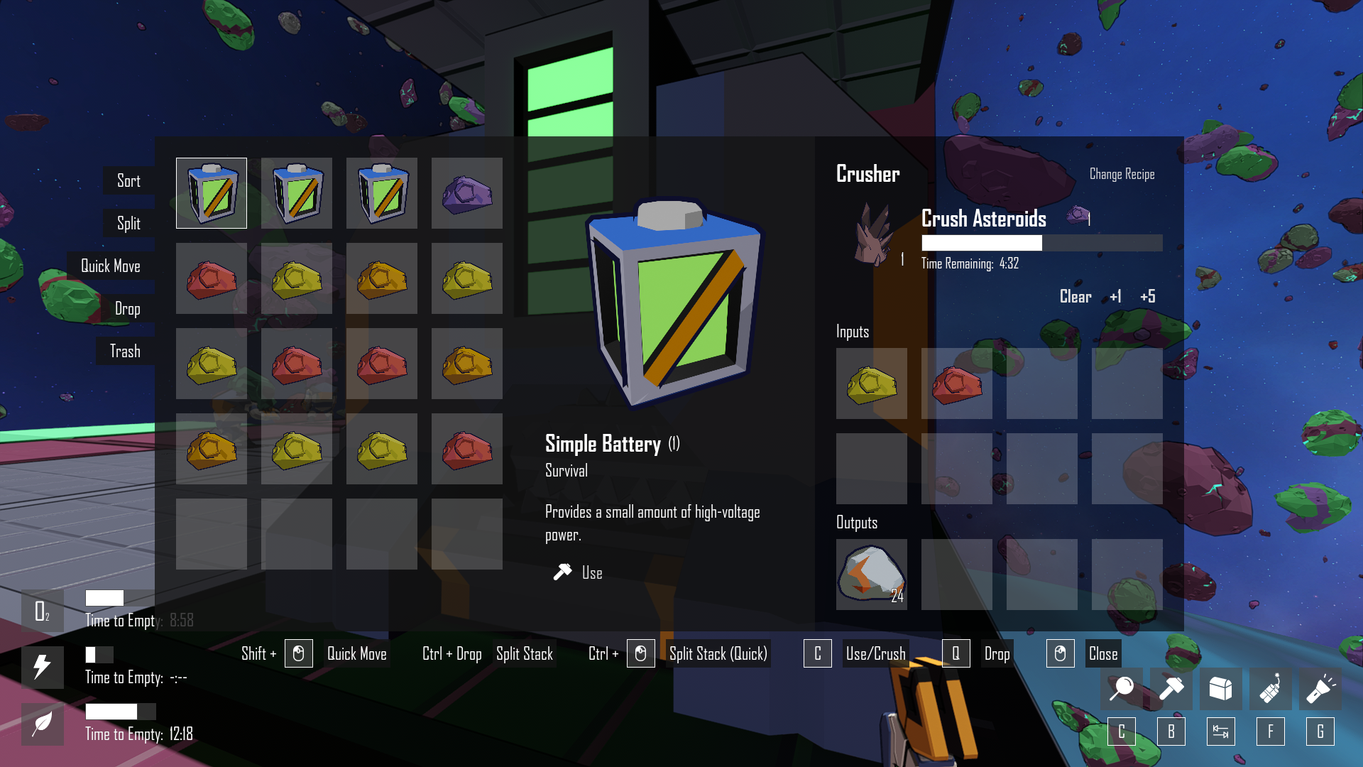 Managing inventory and splitting stacks is great, but should not be the main action of the game. Crafting machines now have three new actions: Clear Inputs, Add One and Add Five which can give you easy methods to load up machines with the right materials. And with the Build Range Extender equipped, it will pull from nearby containers. In creative mode, they appear by space-magic.