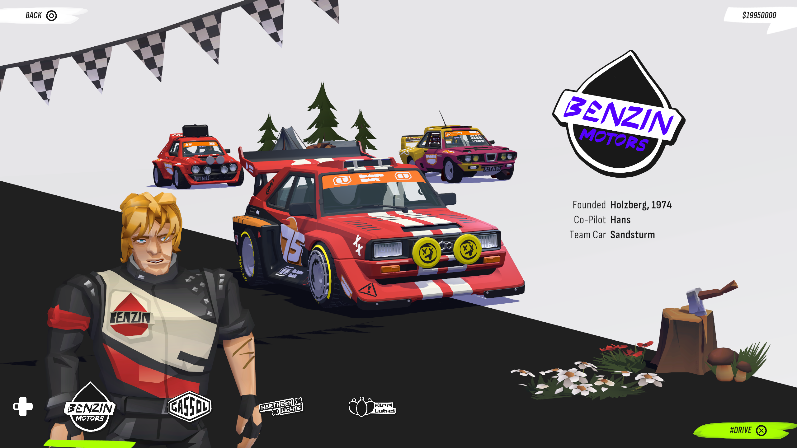 In Holzberg Championship, you’ll join forces with Benzin Motors and your reliable co-pilot, Hans, to battle your way to the top. The championship begins with you behind the wheel of the Das Holzwagen CL, the slowest car class, but don’t worry—each stage in the dense German forest will bring new opportunities to improve!