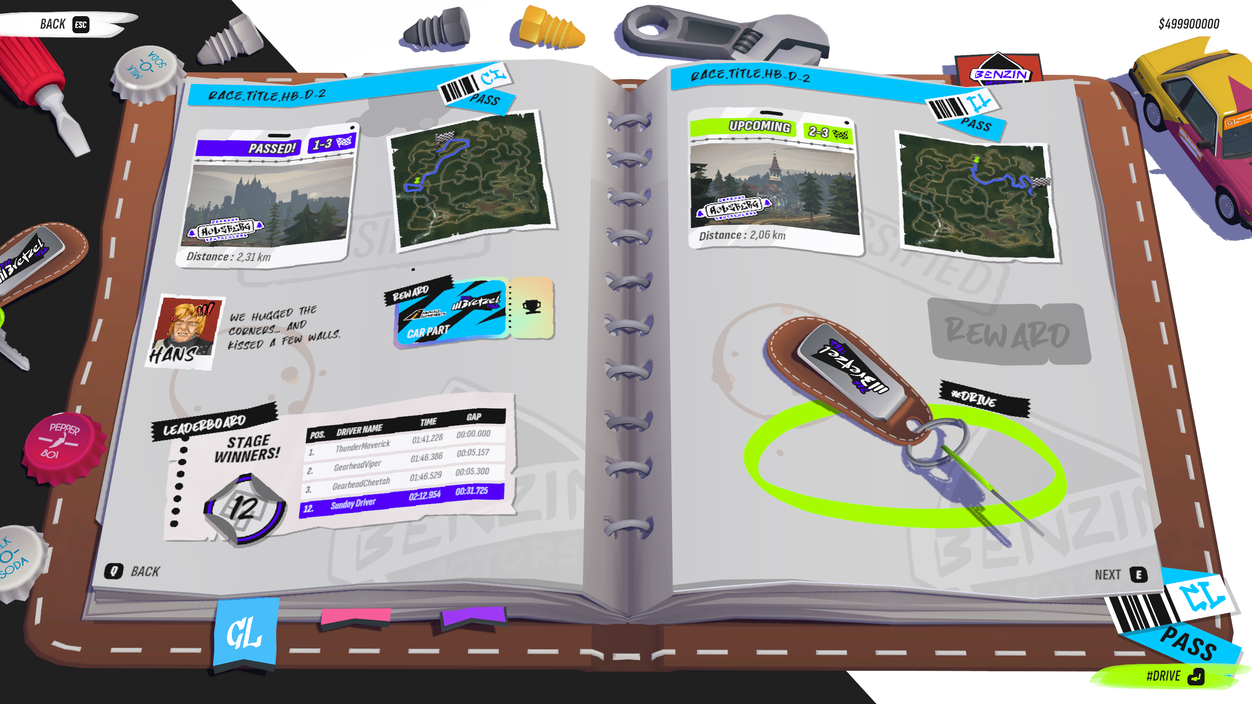 Navigate through Holzberg’s challenging forest tracks, where narrow paths and obstacles demand sharp focus and precise steering. As you progress, you’ll unlock better cars, upgrade to faster classes like RS and XR, and earn rewards like money and car parts—all tracked in your team’s logbook. This logbook becomes your guide, recording every race detail, tracking your performance, and updating as you complete each rally stage.
