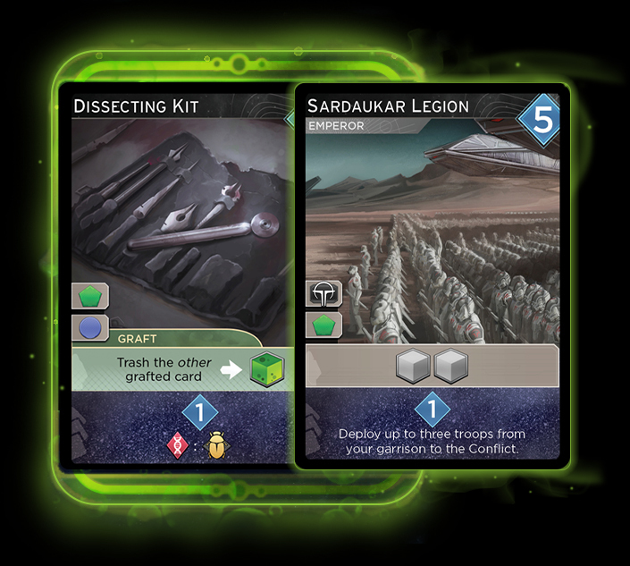 [i]Immortality[/i] brings [b]48 new cards[/b] to [i]Dune: Imperium Digital,[/i] comprising 18 Tleilaxu cards and [b]30 new Imperium cards.[/b] Many of these cards include the [b]Graft[/b] effect, allowing you to [b]play two cards together[/b] in an Agent turn! Graft cards can’t be played alone; they [i]must[/i] be combined with another card. But once grafted together, both cards act as one, granting you access to both of their Agent icons and card effects for the turn.