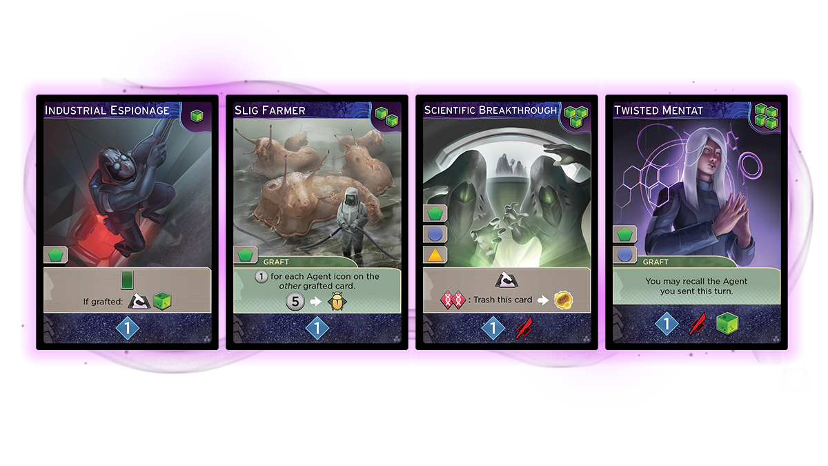 The unique creations of the Bene Tleilax are represented on [b]Tleilaxu cards. [/b]These cards are functionally similar to Imperium cards, but with a key difference: instead of acquiring them with Persuasion, Tleilaxu cards sit on their own row and can only be acquired with [b]specimens. [/b]