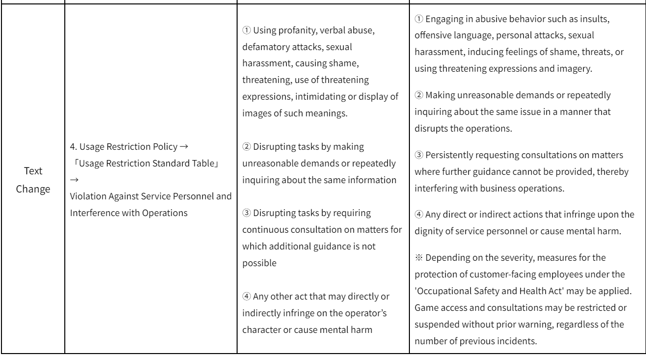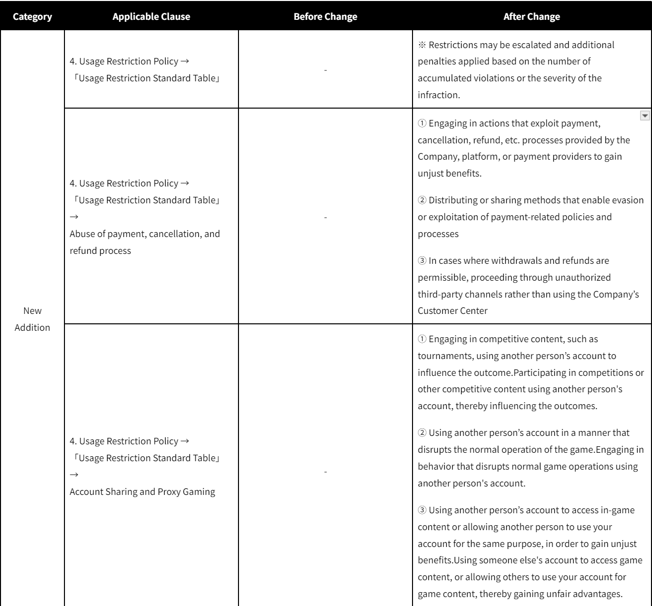 [b]1. Implementation Schedule[/b] - Revision Date : December 11. 2024. [b]2. Purpose of Revision[/b] - Addition of warnings regarding violations of usage restrictions and changes to wording - Addition of sections on ‘Abuse of payment, cancellation, and refund process’ and ‘Account Sharing and Proxy Gaming’ [b]3. Detailed Revision Information[/b]