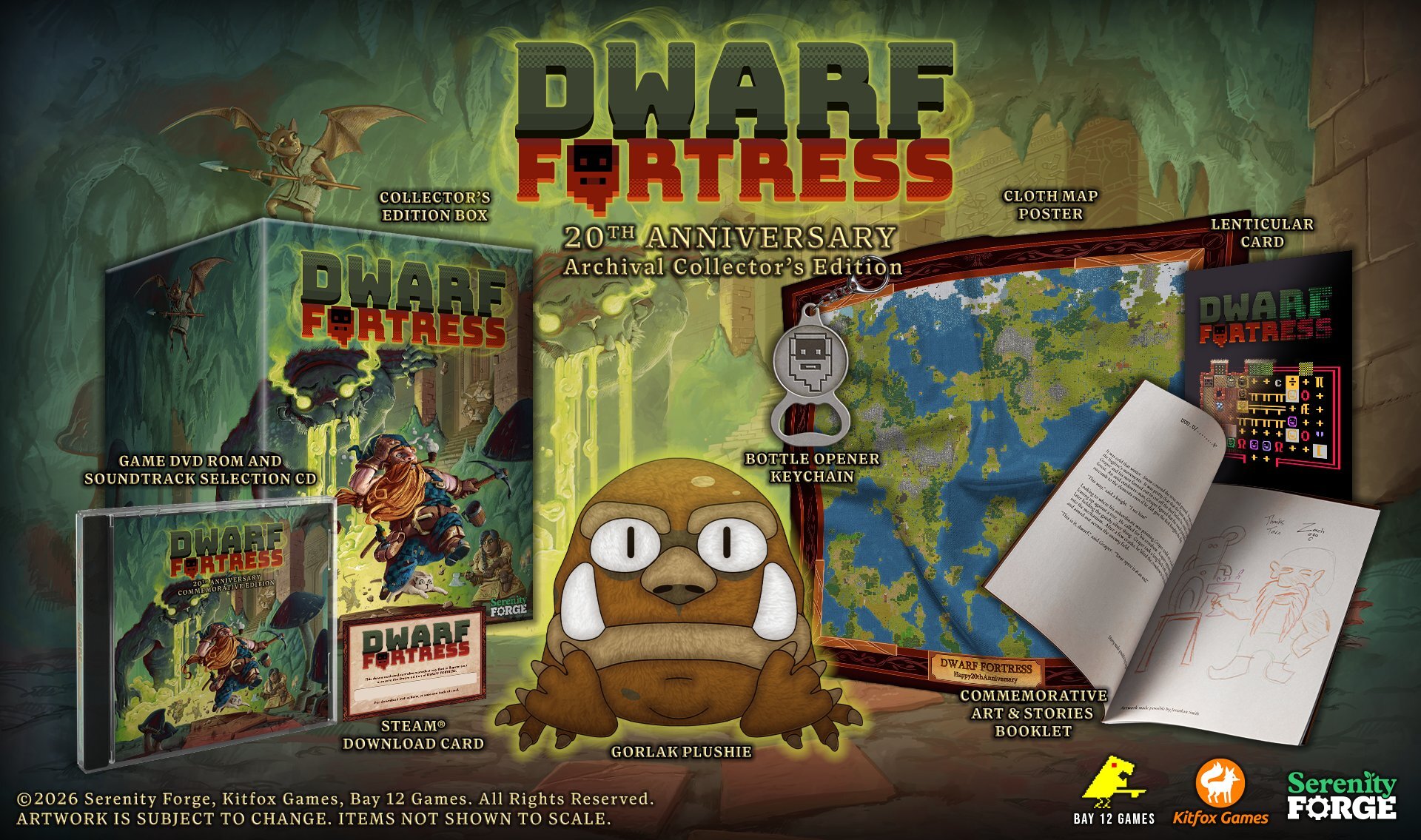 Dwarf Fortress turns 20 next year and Serenity Forge has been working on a Collector’s Edition to commemorate the occasion. Included in this set is the game in a beautiful collectors box, a cloth map of a special DF Anniversary world you’ll be able to visit, a gorlak plushie, bottle opener, lenticular card and a special collection of Zach’s crayon drawings and community fort stories.