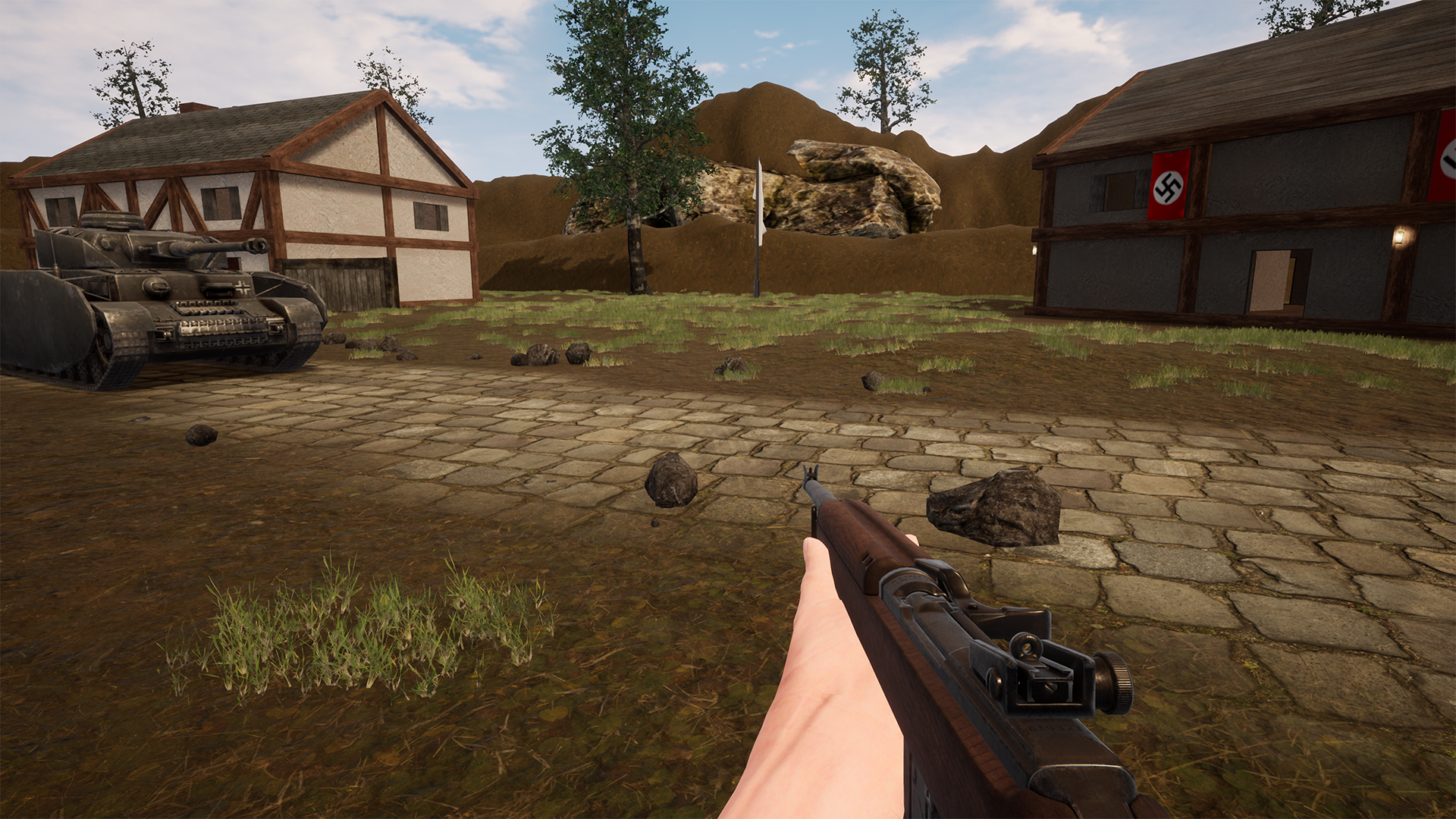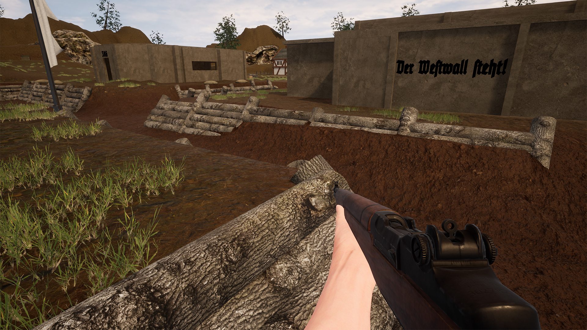 Westwall is a large map, with open areas interrupted by trenches and bunkers. The German spawn side of the map has a barracks, along with some unfinished trenches in front. The American side spawn has two houses, a small storage building, and a road with some tanks parked along it. The center of the map has 4 small bunkers connected by trench lines. You can take the high ground in this map by controlling the large barn adjacent to the bunkers. On the other side of the bunkers you'll have a recessed area with some decoy wooden flak guns. This map features the German and American factions, and works great with a lot of players.