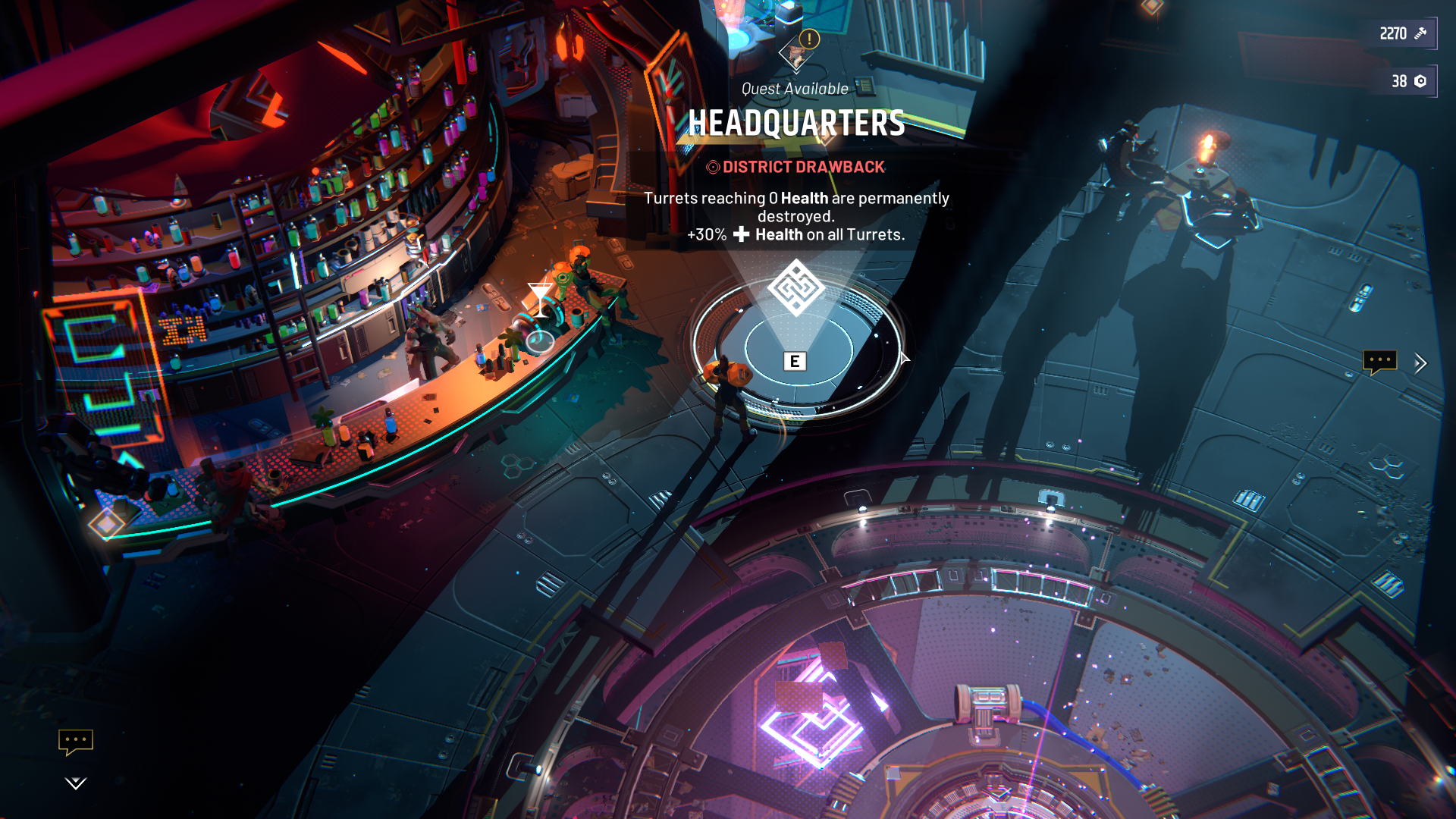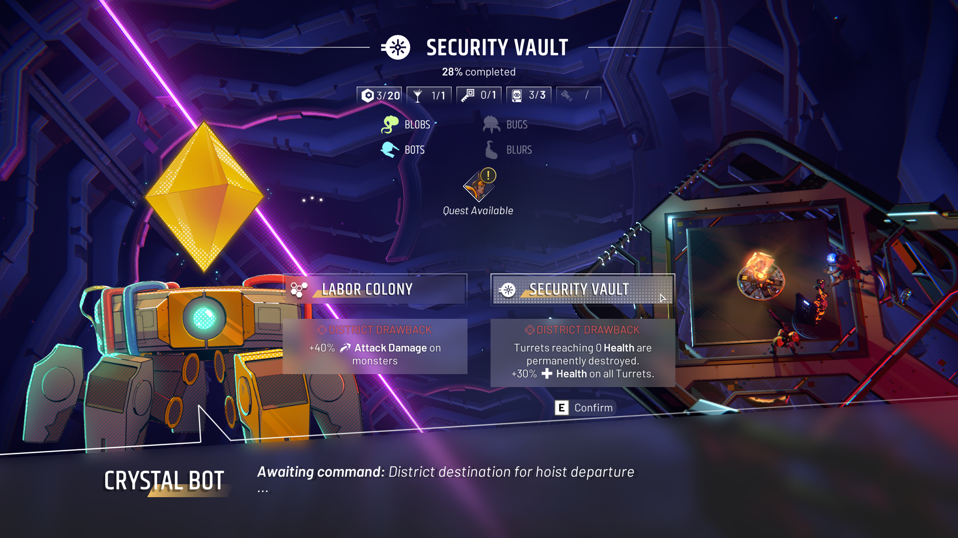 Districts now come with a dangerous effect applied to all zones for that district and only for the current run. Those effects are selected randomly from a specific list of effects. Players will be able to see the effect they will encounter in the following district before choosing it. Be careful, some of the effects can change the way you need to face the district quite a bit. Here some examples- Turrets get +30% HP but are permanently destroyed when reaching 0HP