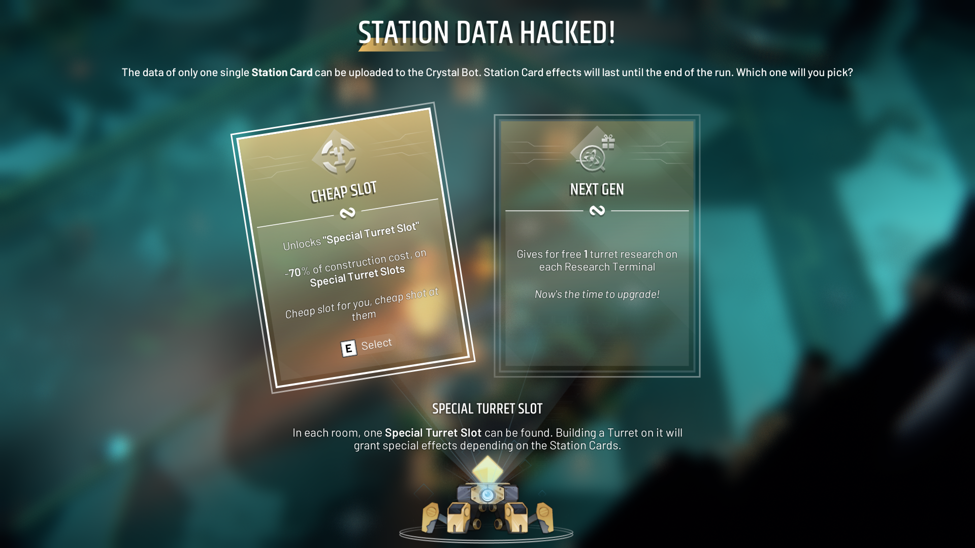 When entering a new district, the Crystal Bot will offer 2 cards (and then 3 with an Improvement at the Workshop). You must pick one at no cost to yourself. These effects are positive, and the chosen effects then stay active for the rest of the run and will synergize with others to create powerful effects.- This will be automatically unlocked when going back to the saloon after having unlocked Comrade’s Workshop (if you have this already then it will be automatically unlocked for you)