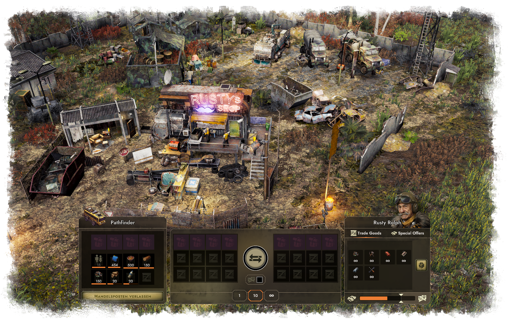 Each trader has their own [b]unique Trading Post[/b] located somewhere in the badlands. The screenshot below showcases [b]Rusty's shop[/b], where you'll meet the feisty and good-humored trader [b]Rusty Rolph[/b], always ready with a snappy saying to brighten your day.