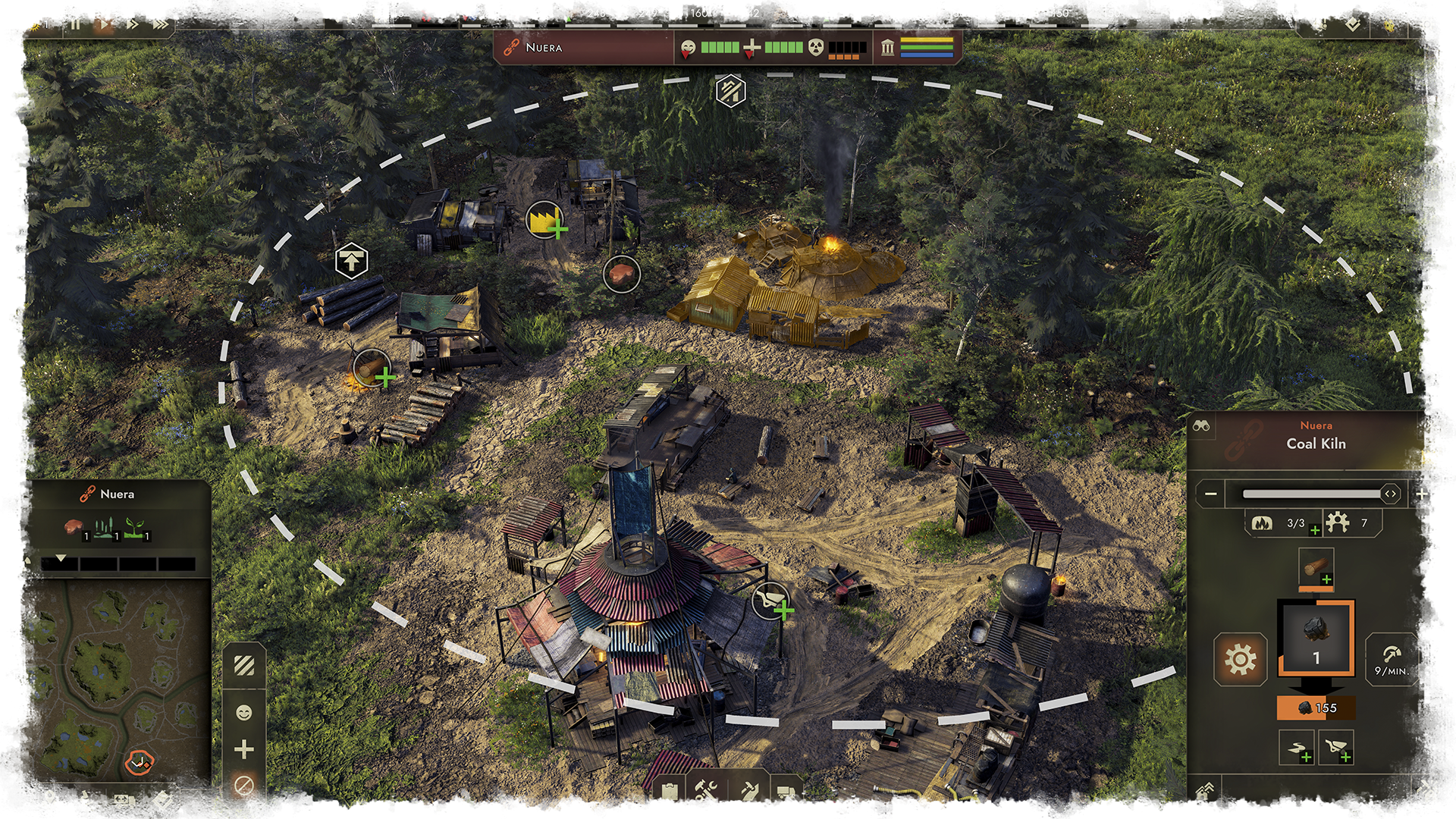 As you can see, there are numerous ways to increase the efficiency of a single building. Most of these methods check the [b]building's radius[/b] to see if certain criteria are met within this area. To boost the Coalmaker's efficiency, we should place it [b]next to the Woodcutter[/b]. Both buildings should also be near [b]storage facilities, such as the Town Center[/b] or a Material Depot, and have nearby [b]housing of the economic type.[/b] The final step is to connect the buildings and the Town Center with a [b]road network[/b]. This setup can boost the Coalmaker's efficiency up to [b]150%[/b]. Of course, the Woodcutter would only add up to 130% as there is no base resource from another building it could profit from.