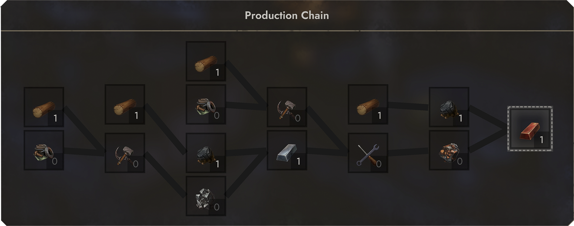 To produce copper, a vast number of different steps need to be fulfilled. As you can see, wood is part of four different substeps in the chain, highlighting its importance even in a late-game scenario where maintaining a constant supply is crucial.