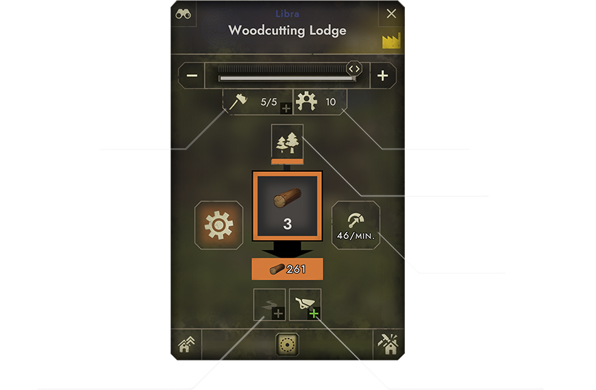 The Woodcutter only needs a nearby environmental resource, which naturally is a lush forest. As long as trees are present, a Woodcutter can produce wood, which can then be used to construct new buildings.