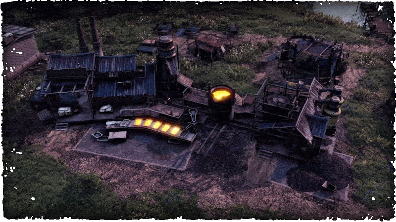 To animate buildings in Endzone 2, certain precautions need to be taken. It's necessary for us to plan ahead in the visual design phase and make compromises. For instance, all objects intended to receive animation must already exist as separate sub-objects within the final building. An example of this would be the crucibles that hold the molten metal of the Iron Caster.