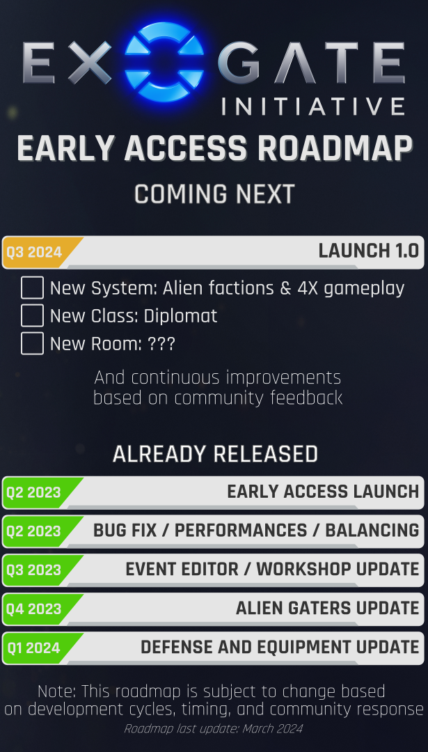 We’re constantly listening to your feedback and using it to improve the game, alongside fixing bugs and adding polish. So please continue to let us know your thoughts about the game - whether it’s here on the Steam forums, on our [url=https://discord.gg/6rfJAsWwSE]Discord[/url], through our [url=https://feedback.exogateinitiative.com/]player suggestions website[/url], or through the in-game feedback tool itself. As we near our all-important 1.0 launch, we’ll need all your support to help us make as big a wormhole-splash as possible! If you’ve not yet reviewed the game on Steam, now would be a great time to do so, which will boost us in the algorithm and help us reach as wide an audience as we can. Or if you’re waiting for the 1.0 launch to pick up the game, then a [url=https://store.steampowered.com/app/1681060/Exogate_Initiative/]wishlist on our store page[/url] would also be a huge help. And as mentioned, for anyone who’s considering purchasing the game to check out the latest update, it’s [url=https://store.steampowered.com/app/1681060/Exogate_Initiative/]on sale at 25% discount for 10 days[/url]! We’ll be in touch again as we move closer to the 1.0 launch. But for now, we hope you enjoy the new patch, and wish to thank you for your continued support. Until the next Exogate activation! Safe travels, Maxime MILLET Creative Director, Xeno BitsChangelog 0.8.7