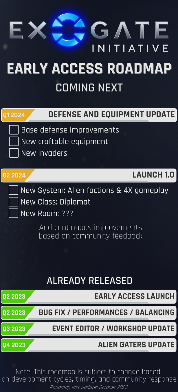 In case you missed it, we recently shared our [url=https://steamcommunity.com/games/1681060/announcements/detail/3717218046707304656]Early Access roadmap progress[/url]. With the Alien Gaters patch now out, we’ve updated the roadmap so you know what to expect and when, as we continue towards our 1.0 launch: