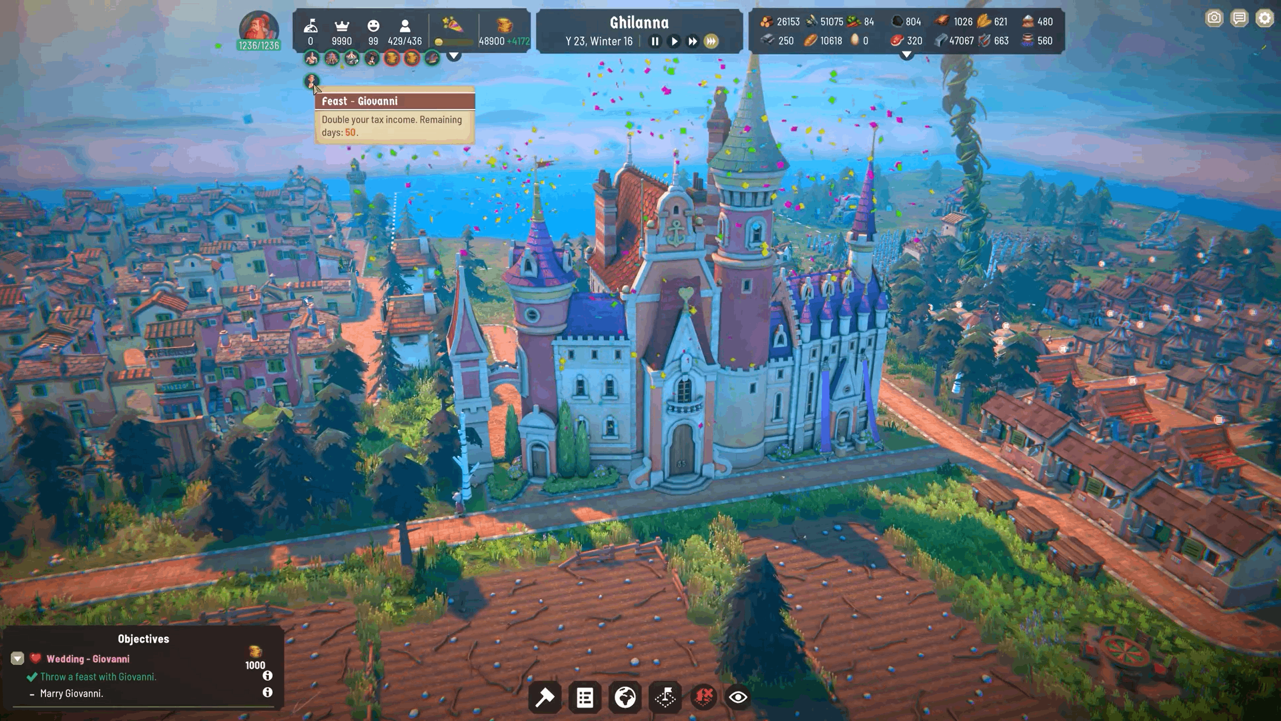 In the palace, you can produce feast supplies or build ministries to gain different passive bonuses for your kingdom. This is also where you will build the wedding hall, which brings me to our next feature.