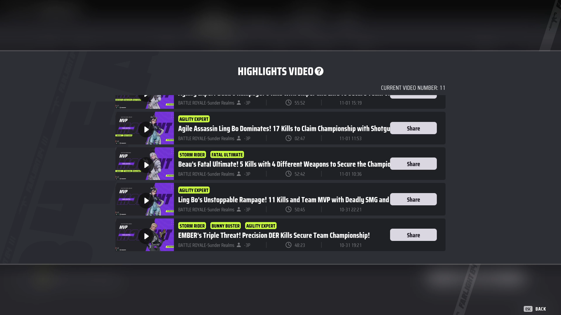 a. Highlights videos will be saved automatically to the cloud once recording is enabled. Saving to the cloud does not take up local storage space. b. Reminders will be shown in the match summary if a valid highlights video has been created. c. Highlights videos can be viewed and shared by going to Profile - Battle Record. Both horizontal and vertical video is supported, allowing you to share to different platforms. d. Personalized titles will be generated for each highlights video based on their content.