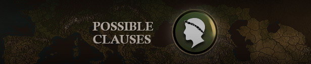 There are twelve possible clauses. Most can be used in both treaties, but some are restricted to only one type. (T) means it is only available in a transaction treaty while (P) means it will only be available in a peace deal. If nothing is indicated, both treaties support the clause.