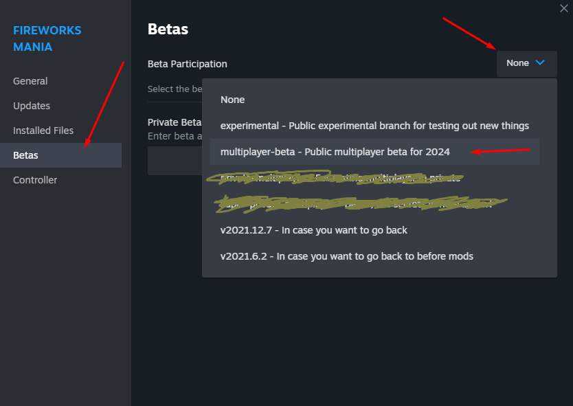 To join the multiplayer beta you need to switch to the "multiplayer-beta" branch here on Steam. Right click on Fireworks Mania --> Properties: