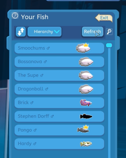 Depending on the result of the challenge, a fish’s hierarchy stat will increase or decrease, which affects its overall state of fear, which affects its overall health.
