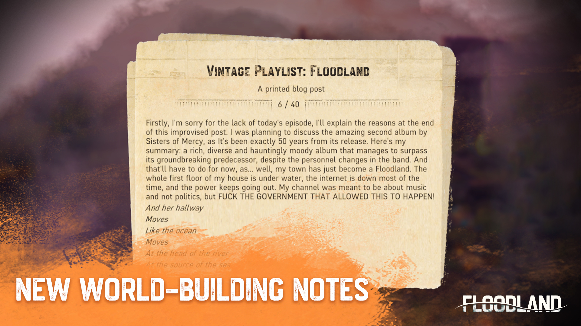 Floodland offers a rich world and a lore for those who uncover remnants of the old world. We won’t spoil them here, but there are around 20 new notes to find for those who enjoy a deep dive.