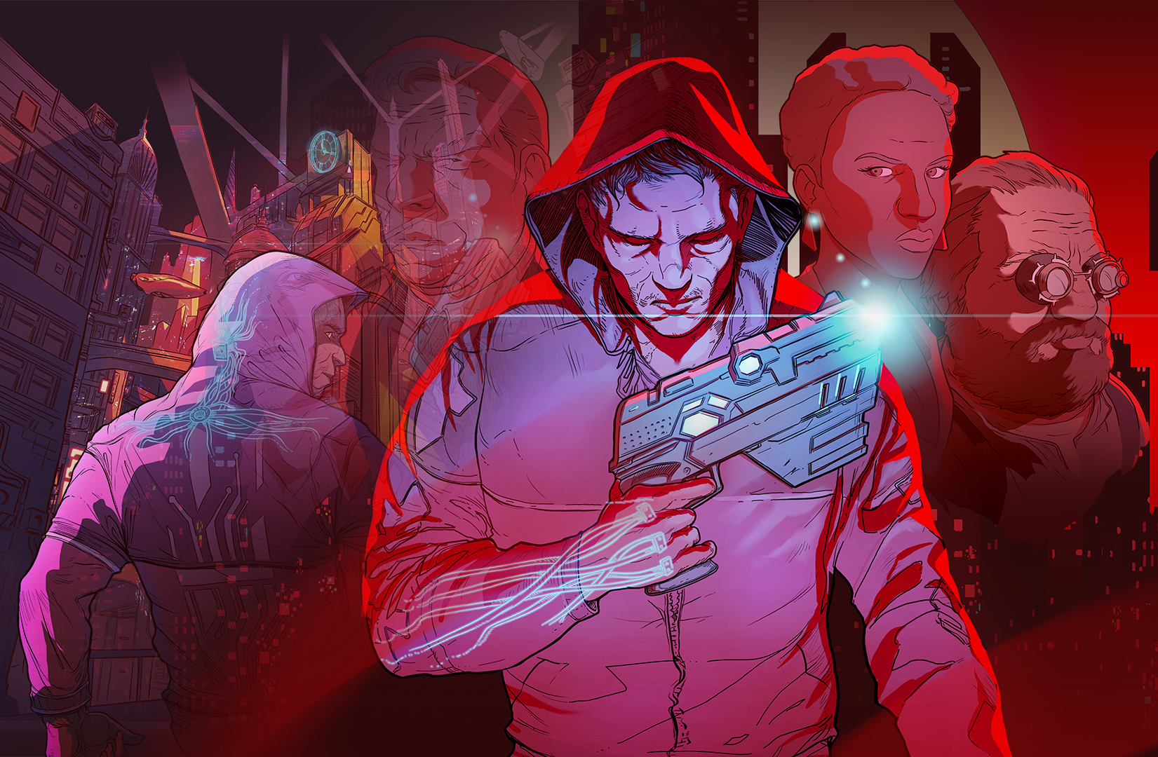 Our first art image we highlighted the main character, (Evan) Kapnos, in the city. We wanted to showcase the vibrant city and the cool tech in the game, both in the character and in the weapon, the Symbiotic Pistol.