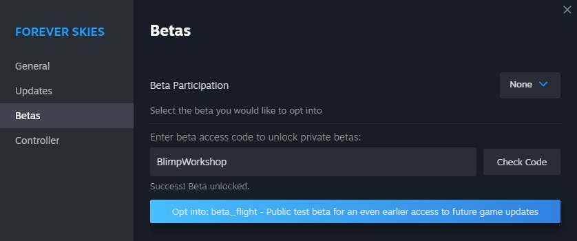 - From the dropdown menu select the beta branch tilted: beta_flight
