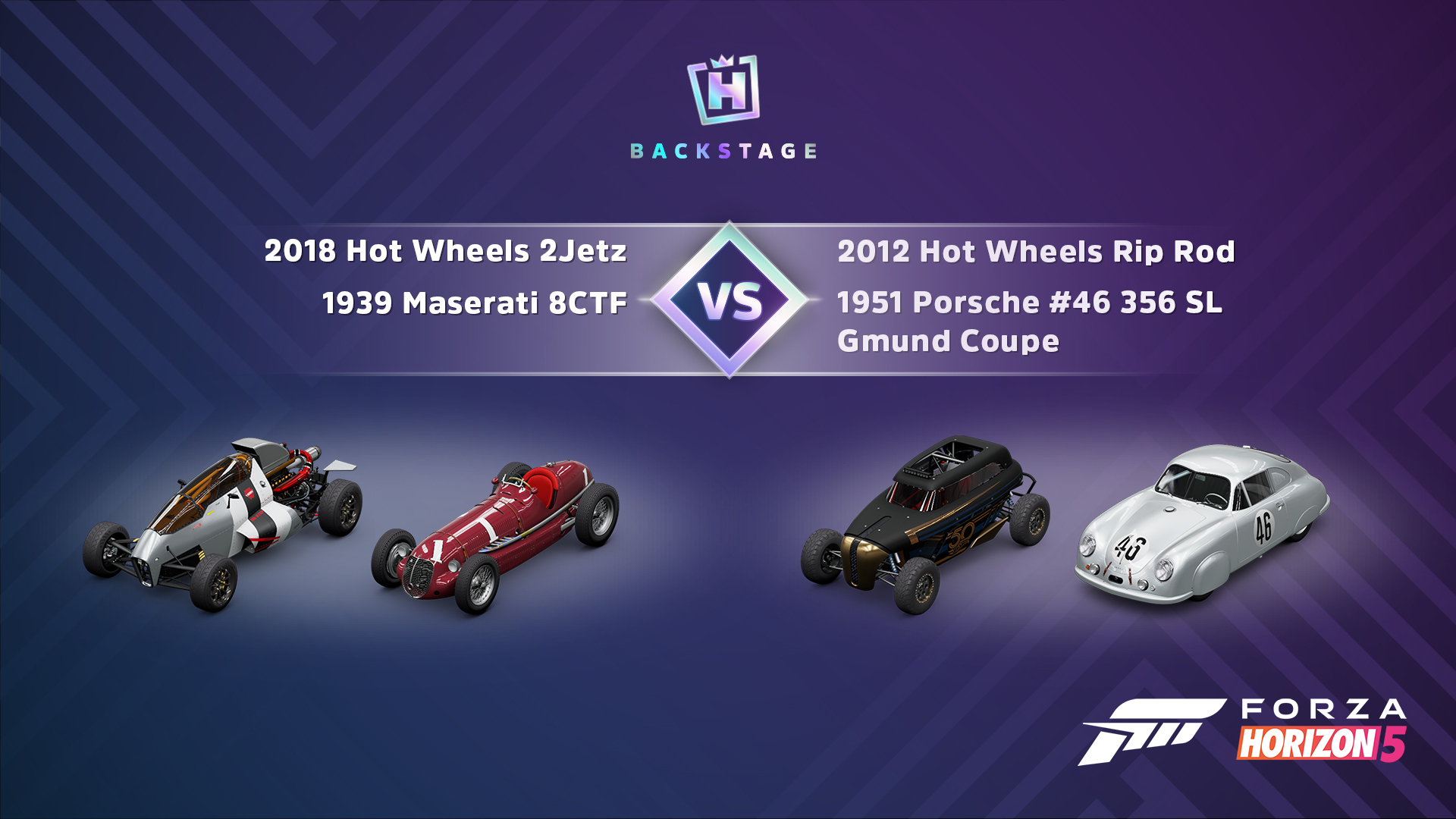 The first pair is made up of the very first winner of the Hot Wheels Legends Tour, a car that perfectly blends past and future: the [b]2018 Hot Wheels 2JetZ[/b]. To its side you will find a legend of the track—say hello to the [b]1939 Maserati 8CTF[/b], otherwise known as “the Italian sausage.”