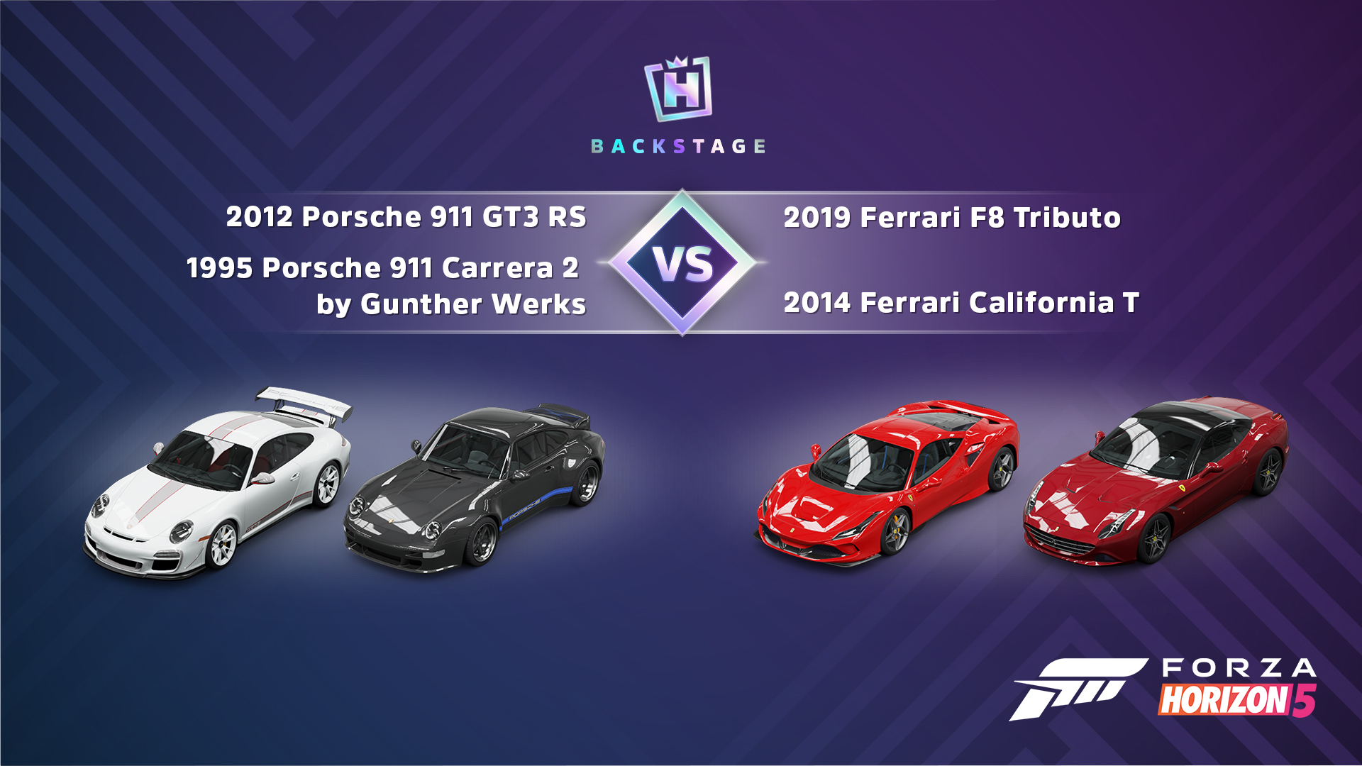 The Maranello locals start the game with the [b]2020 Ferrari F8 Tributo[/b], a moving homage to the 3.9-liter twin-turbocharged V8 engine crowned as Ferrari’s most powerful. Team Ferrari closes out this week’s bout with the [b]2014 Ferrari California T[/b], a gorgeous convertible with the heart of a GT champion.