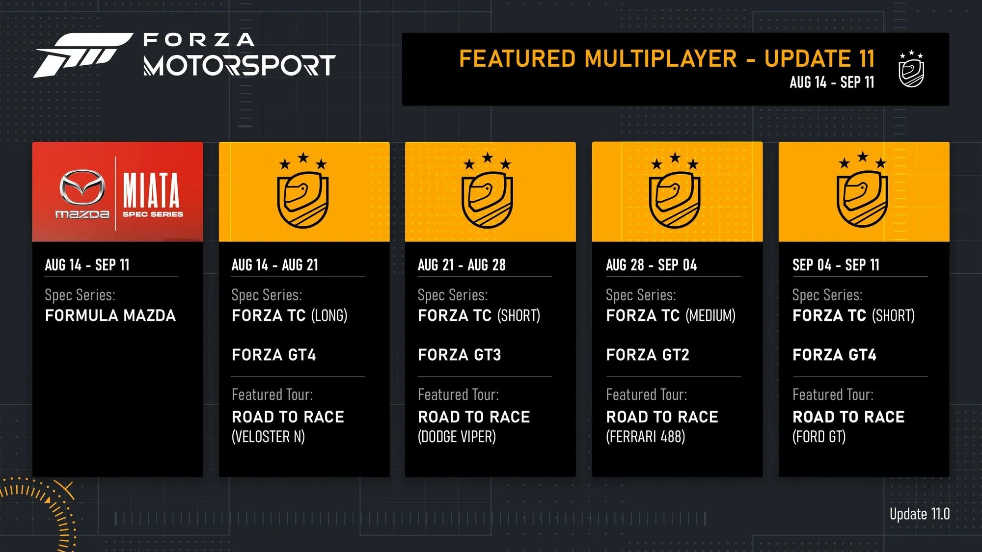 [tr][td][b]Road to Race (Dodge Viper), Forza GT3 Series, Forza Touring Car Series (Short)[/b][/td][td]GTP/C + GTX Sportscars[/td][td]Multi-Class Series (E, D, C) + A Class Series + D Class Series + X Class Series[/td][td]Ferrari 458 Italia[/td][td]August 21 5pm PT / August 22 12am UTC[/td][td]August 28 5pm PT / August 29 12am UTC[/td][/tr]