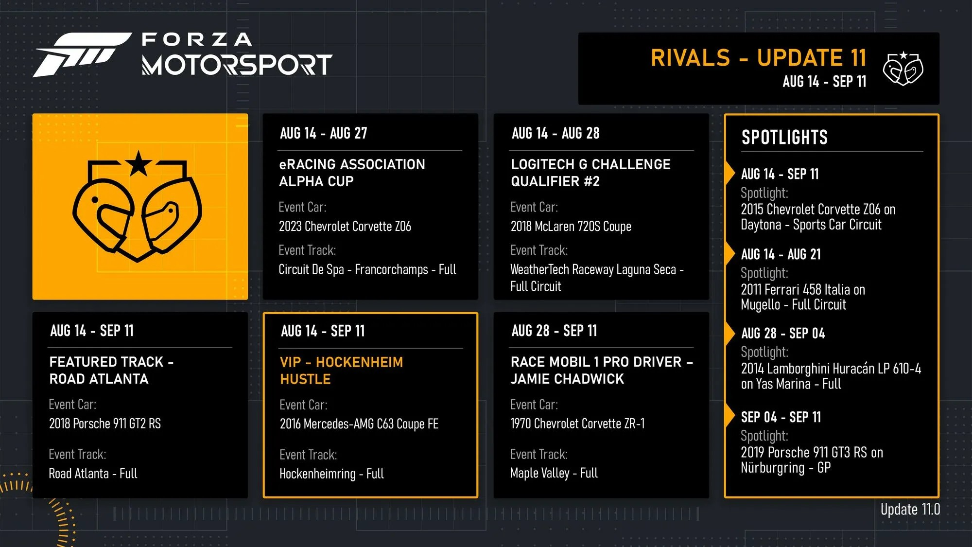 Forza Motorsport Update 11 rolls out for download starting Monday, August 12 on Xbox Series X|S and PC via the Microsoft Store and Steam. Spotlight cars and new in-game events will begin on Wednesday, August 14 starting at 5:00 PM PT (12:00 AM UTC on Thursday, August 15).