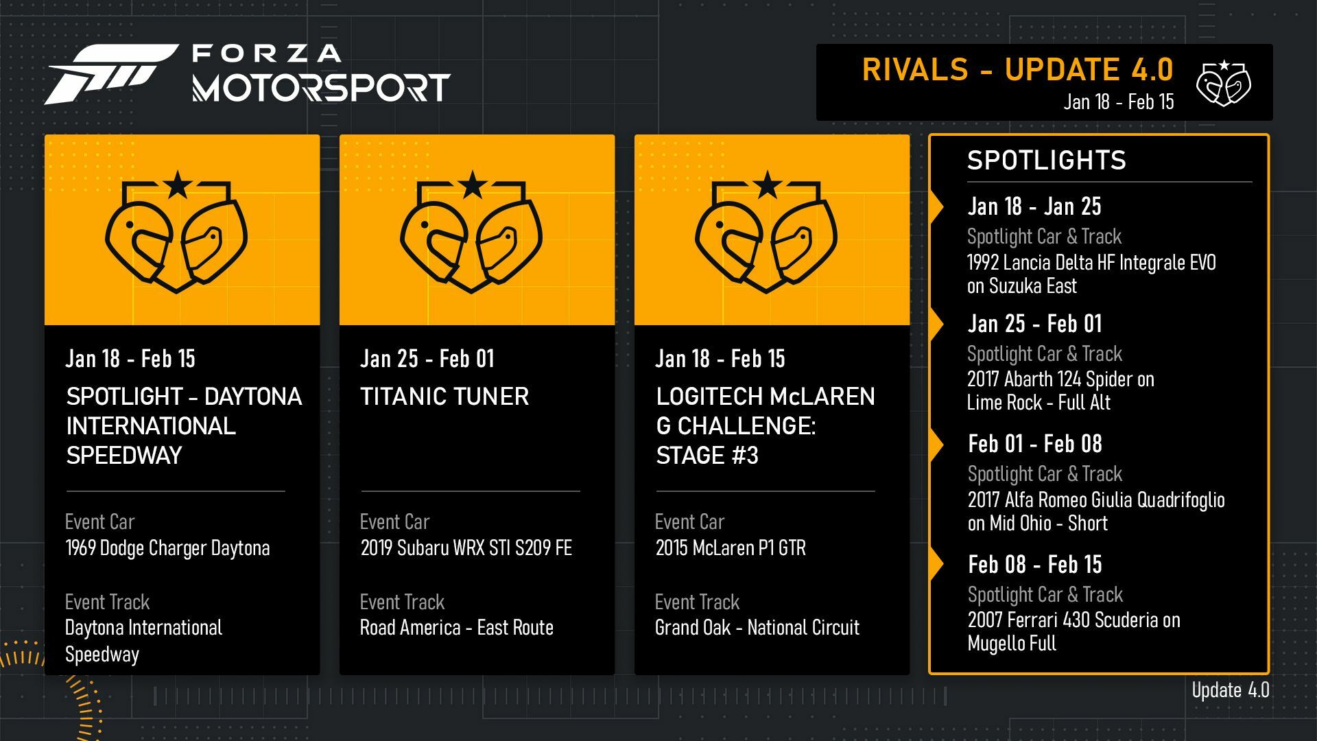 Here’s a look at your Featured Multiplayer calendar of upcoming events for Update 4: [table] [tr][th][b]Spec Series [/b][/th][th][b]Open Series [/b][/th][th][b]Spotlight Series [/b][/th][th][b]Availability [/b][/th][/tr] [tr][td]Forza P1 Series, Formula Mazda Series [/td][td]S Class Series, A Class Series [/td][td]1992 Lancia Delta HF Integrale EVO [/td][td]January 18-24 [/td][/tr] [tr][td]Daytona Sports Car Series, Formula Mazda Series [/td][td]X Class Series, C Class Series [/td][td]2017 Abarth 124 Spider [/td][td]January 25-31 [/td][/tr] [tr][td]VW Golf GTI Spec Series, Formula Mazda Series [/td][td]R Class Series, E Class Series [/td][td]2017 Alfa Romeo Giulia Quadrifoglio [/td][td]February 1-7 [/td][/tr] [tr][td]Modern Factory Racecar Series, Formula Mazda Series [/td][td]P Class Series, B Class Series [/td][td]2007 Ferrari 430 Scuderia [/td][td]February 8-15 [/td][/tr] [/table]Formula Mazda Series – January 18 – February 15