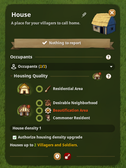The first thing you’ll notice when clicking on a house are new Housing Quality details, the first one of which is to be located within a Residential Area. Furthermore, in order to upgrade, a house will need the following:- Desirable Neighborhood (away from noisy and dirty environments)