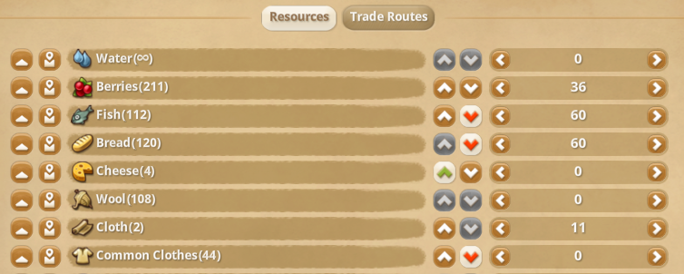 - Resources tab (F3): label icons used for the Buy from them and Sell to them sections have been modified to up and down arrows in an effort to convey trading feedback more efficiently
