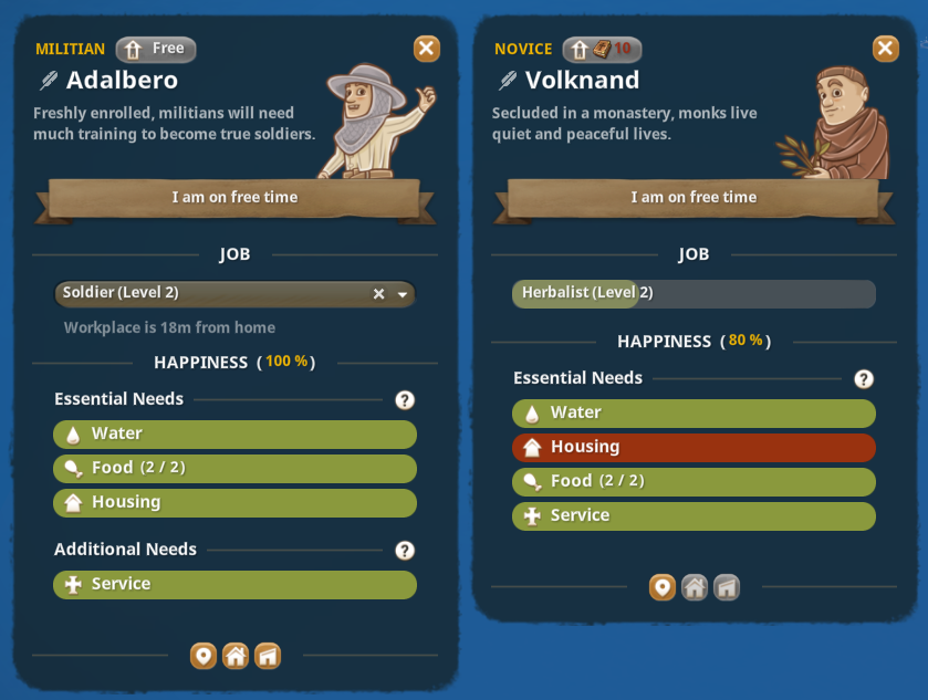 Foundation was always meant to remain a calm and pleasant experience where you can play at your own pace, so it was important for us to ease down a bit the pressure of filling the needs of your villagers, especially when you have your first Commoners. As such, we’ve separated the Needs in two main categories:- [b]Essential Needs[/b] – must be fulfilled, else they trigger a shortage leading to a Happiness penalty