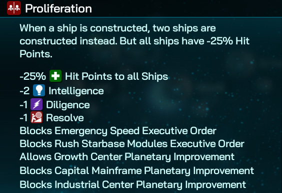 Proliferation helps out if war does break out: sure, your battleships are smaller and less durable than their rivals, but you get two for every one you pay the Military points for. What the Mimot lose in individual combat strength, ship by ship, they more than make up for with the ability to literally be in two places at once, and the strategic options that this tactical agility grants them cannot be understated. And in combat, you get twice the firepower!