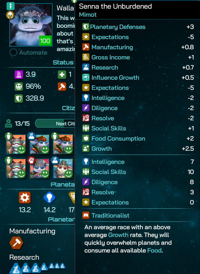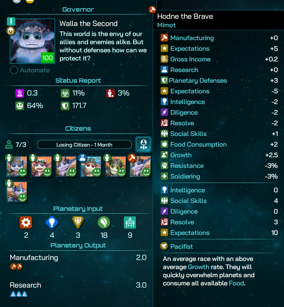 There is a downside to all this rapid growth: the Mimot tend to run low on Food pretty quickly, and much of your Core Worlds' real-estate will be dedicated to housing and feeding your Citizens. The Mimot themselves aren’t the best Citizens and that Food consumption doesn’t get you much: your average fuzzball is kinda cute and entertaining, but he doesn’t know much about anything and rarely lifts a finger to get anything done either.
