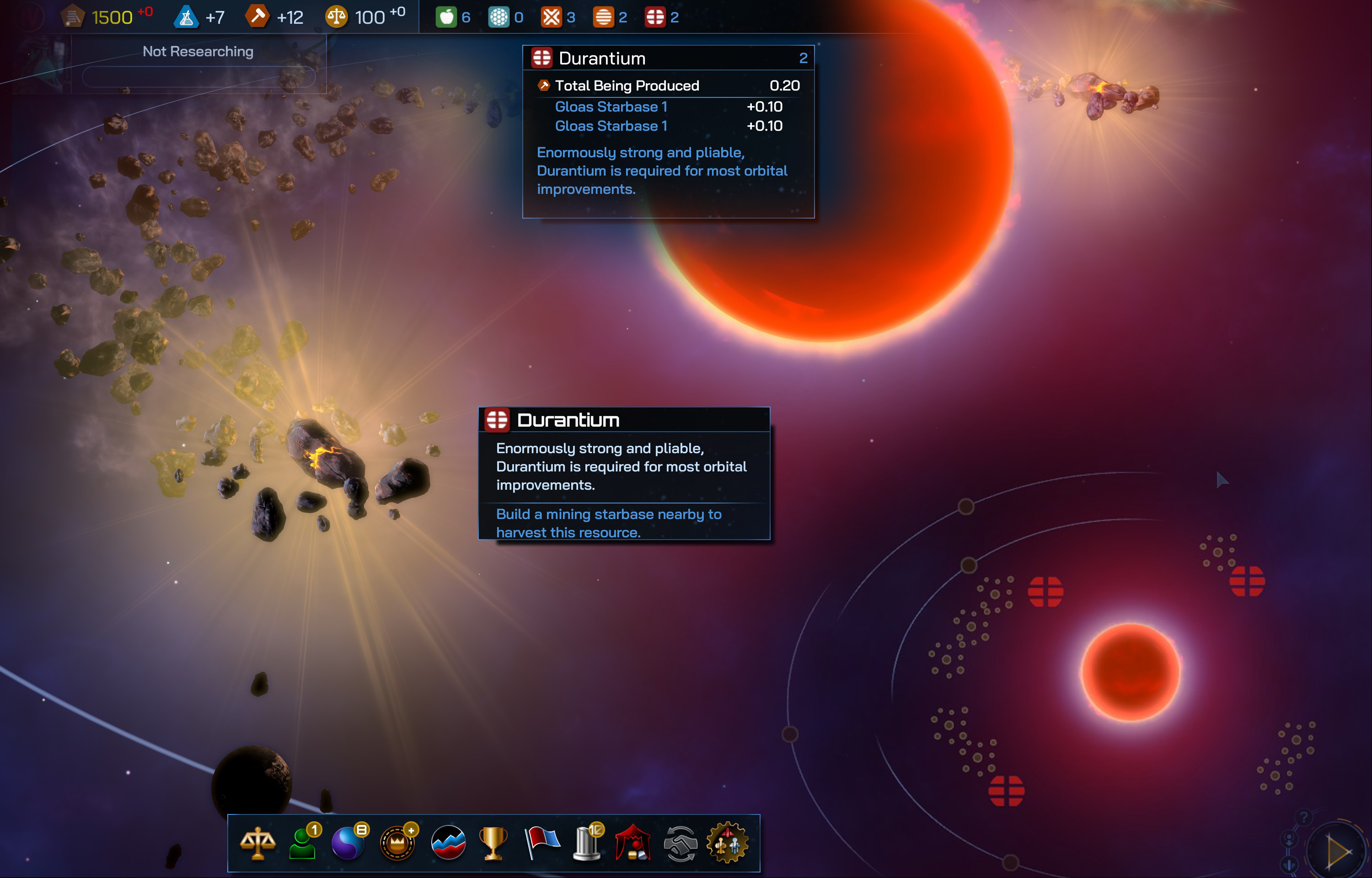 Each Resource can be found scattered across the map as you explore. The first two Resources, Durantium and Promethion, can both be found spawned around stars of any color. Durantium specifically tends to spawn near stars with long asteroid belts (though it can be found around stars without them), while Promethion tends to favor stars without asteroid belts, with some exceptions.