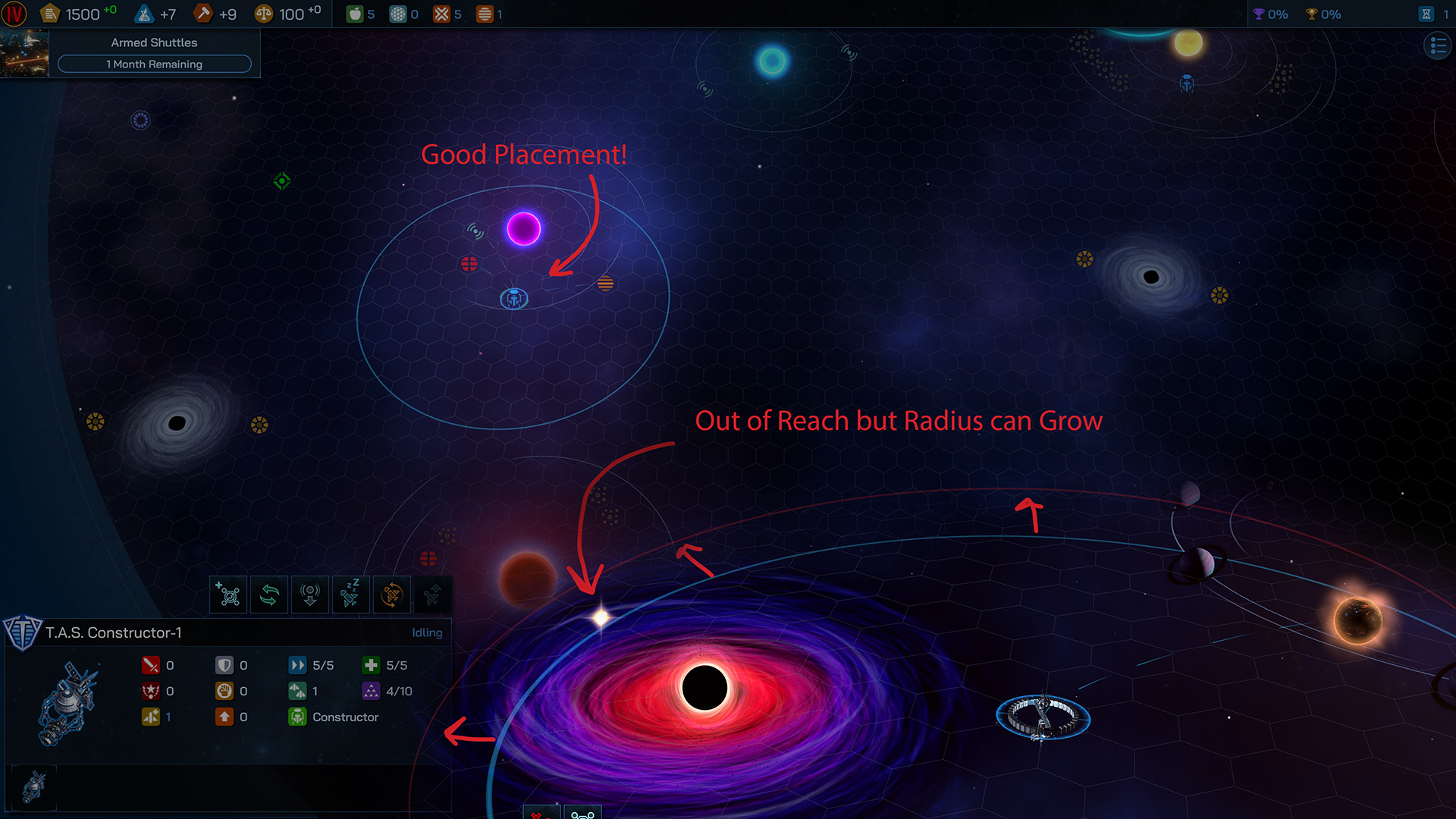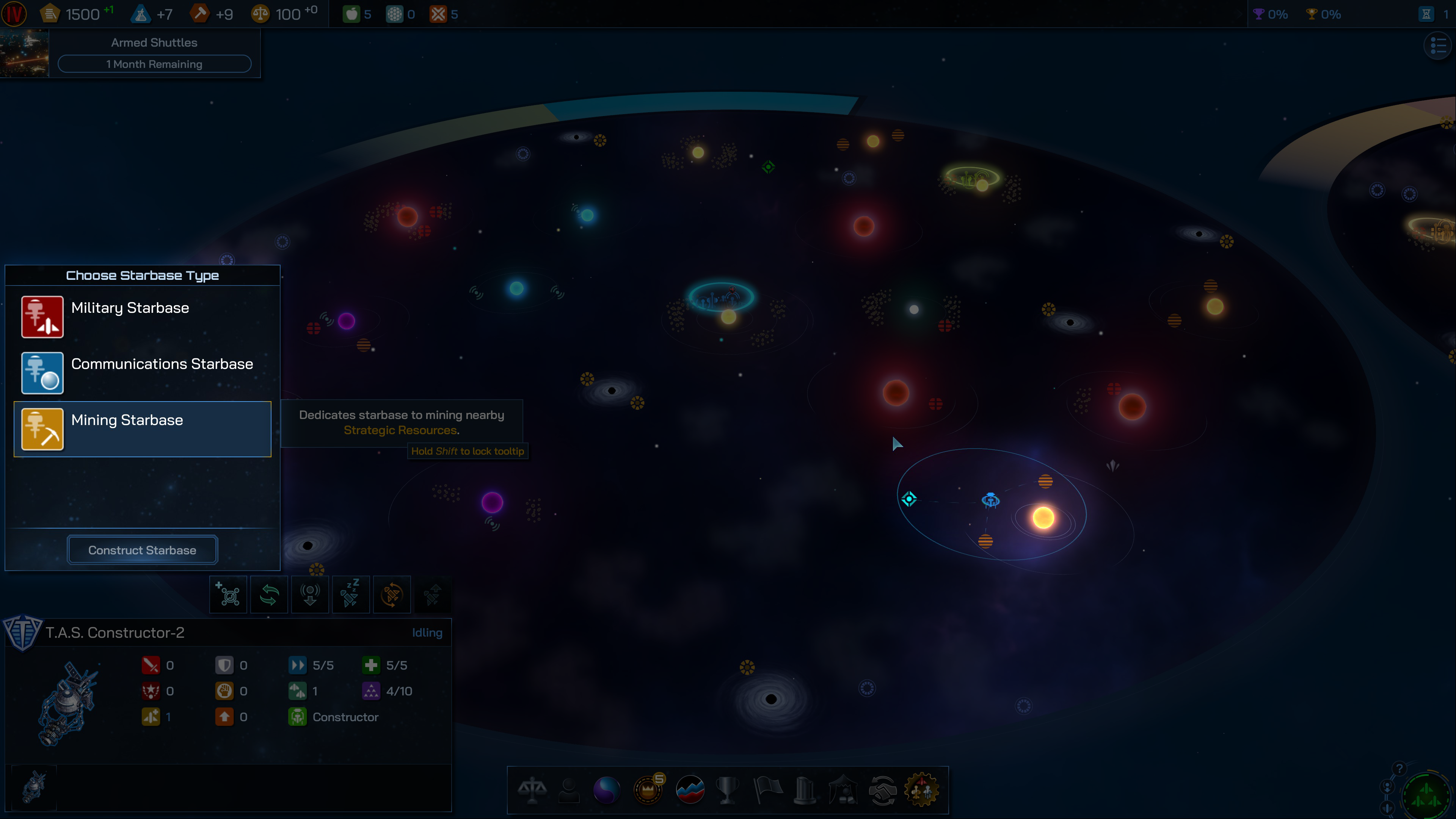 Resources found around stars and on the edges of black holes can be collected over time by well-placed Mining Starbases. Constructor ships are used to build these Mining Starbases. When flown to a desired tile, they can be converted into the Starbase of choice. Starbases come in four varieties: Mining, Economic, Military, and Communications. Mining Starbases will only appear as an option if a minable Resource is within that Constructor/starbase’s radius.